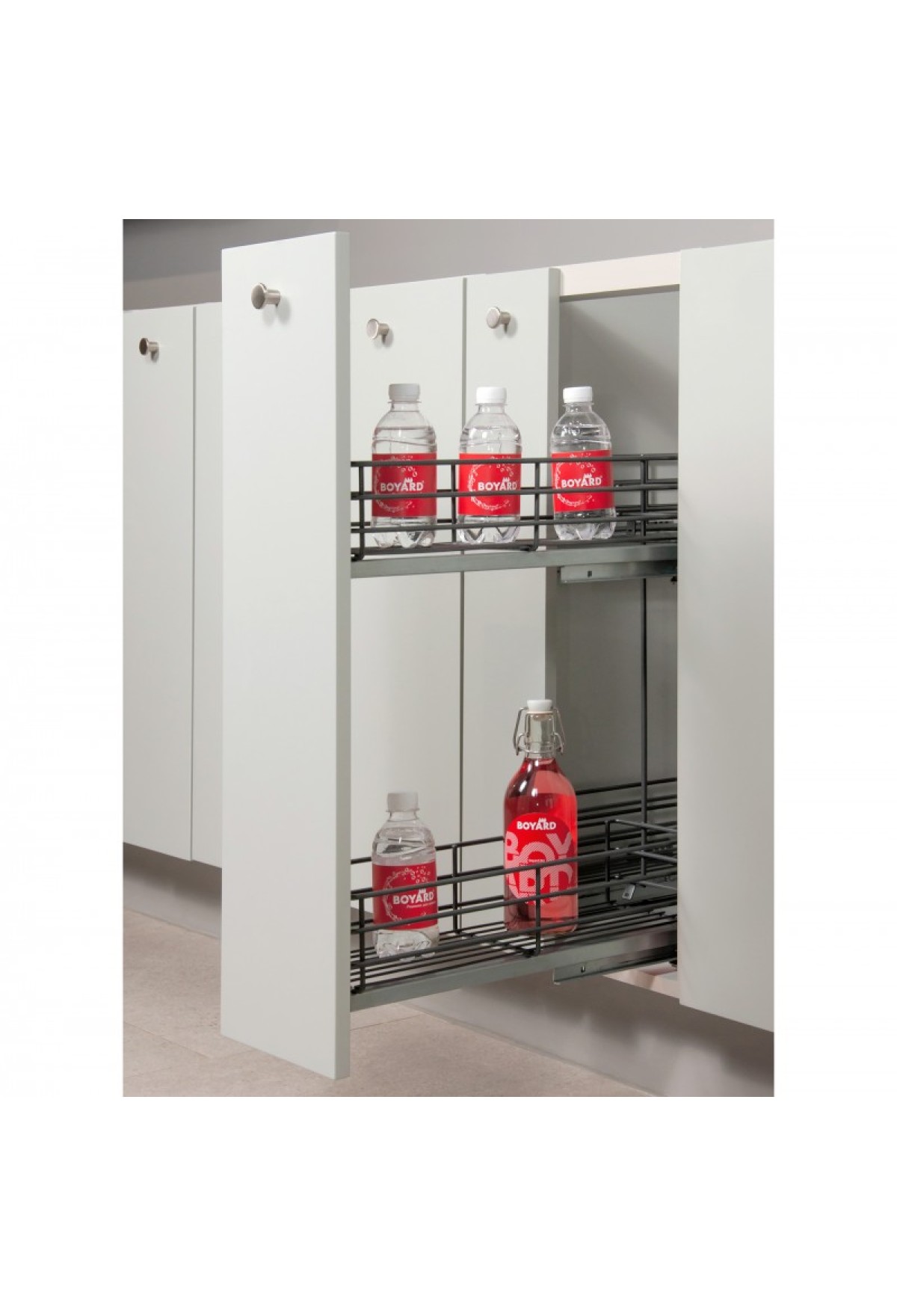 Bellissimo функционирует на направляющих скрытого монтажа полного выдвижения с амортизацией. Модель обеспечит удобный полный доступ к продуктам и жидкостям. Ассортимент Bellissimo включает четыре варианта бутылочниц для нижних баз кухонных гарнитуров: для модулей размером 150 мм и 200 мм с левым или правым расположением направляющих.