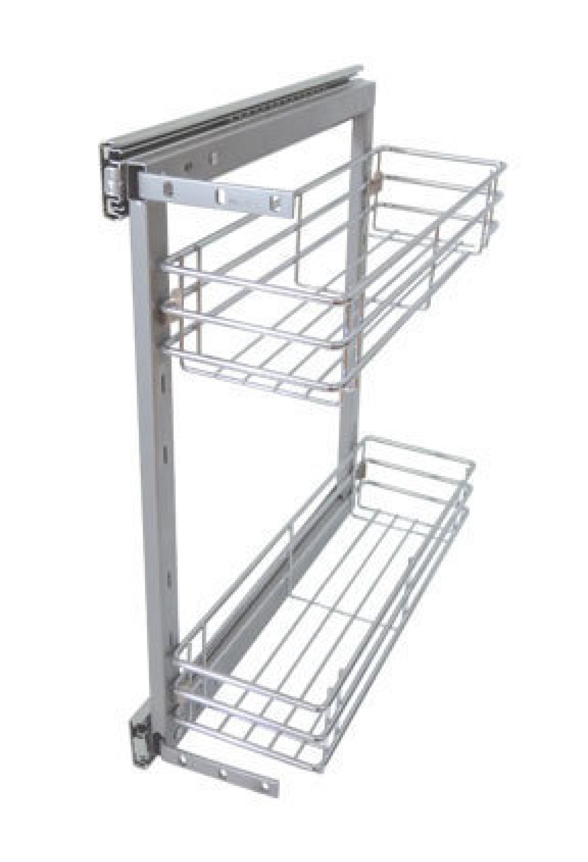 На нижней корзине можно разместить средства по уходу, бытовую химию, в том числе в высоких бутылках. Верхняя корзина послужит для хранения разнообразных аксессуаров для уборки кухни. Размещение моющих и чистящих принадлежностей – это лишь один из множества вариантов использования такой конструкции. Хранение круп, утвари, узких и высоких сосудов – всего, что пожелает хозяйка. Предназначение такой корзины зависит и от ее размещения в той или иной кухонной зоне.