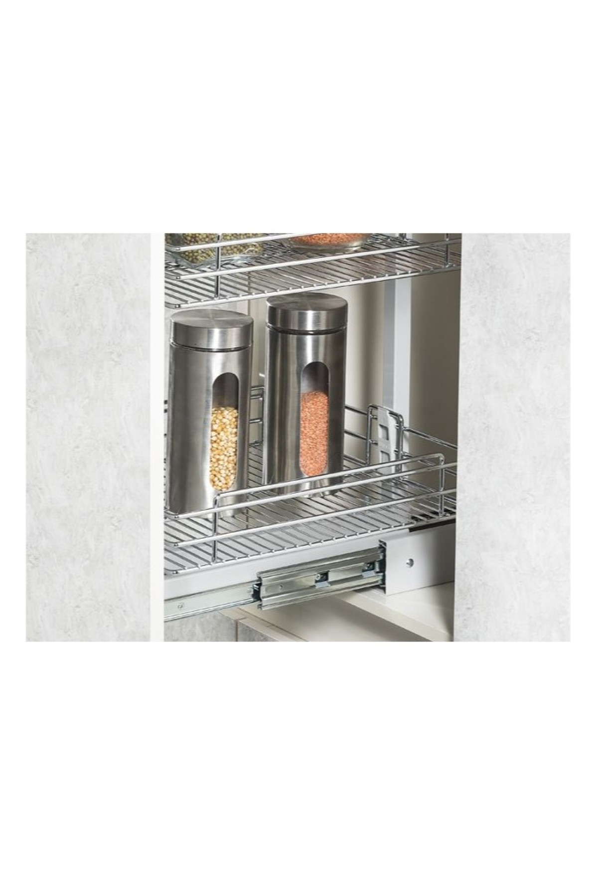 Шкаф-колонна устанавливается в кухонный шкаф и полностью выдвигается вместе с фасадом, создавая максимальный доступ ко всем вещам.