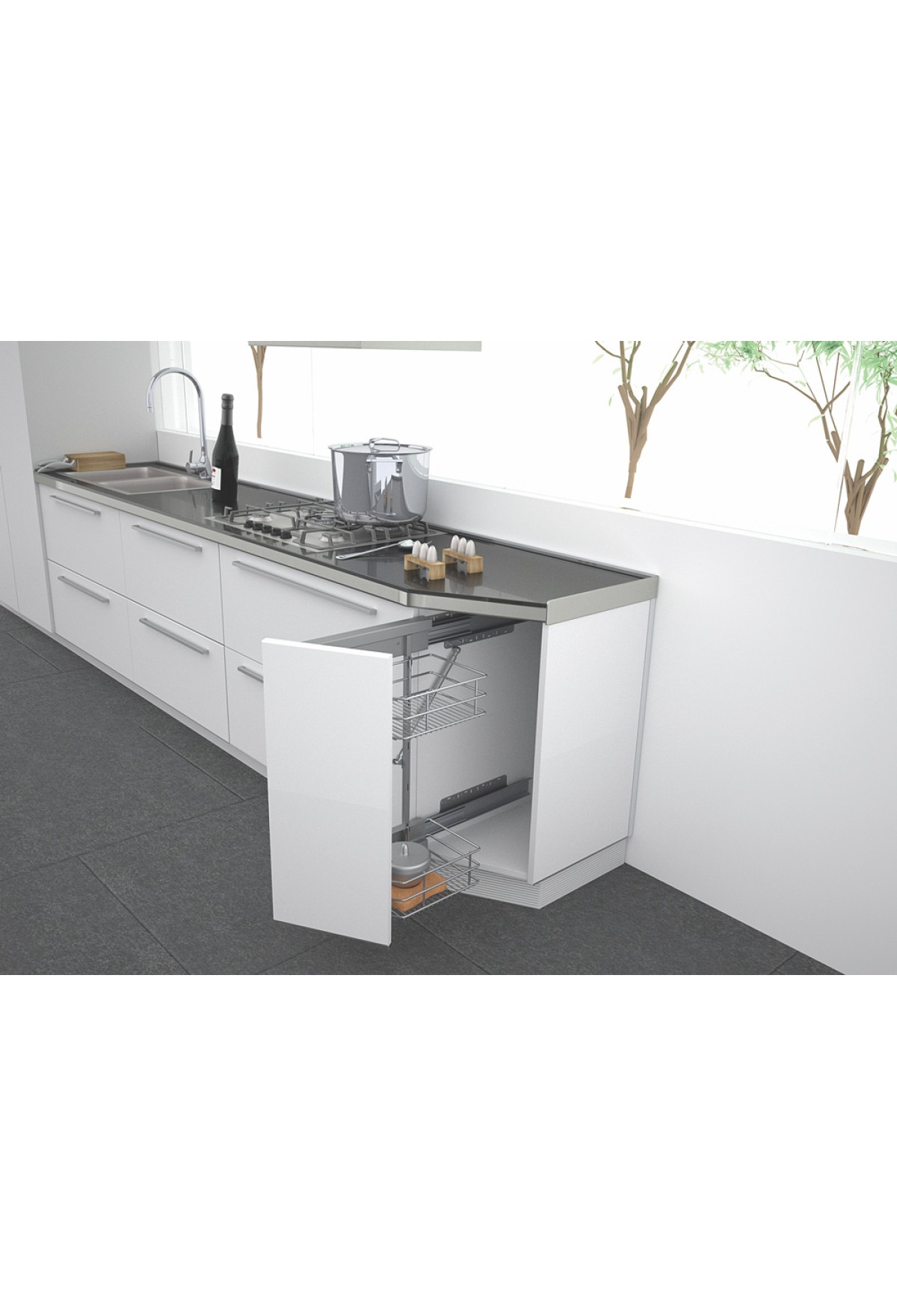 Функциональное оснащение шкафа со скошенным фасадом. Прекрасный обзор и легкий доступ к содержимому. Газовый лифт обеспечивает плавное открывание нагруженной конструкции и мягкое закрывание. Выдвижная система в шкаф 300мм со скошенным фасадом, левая