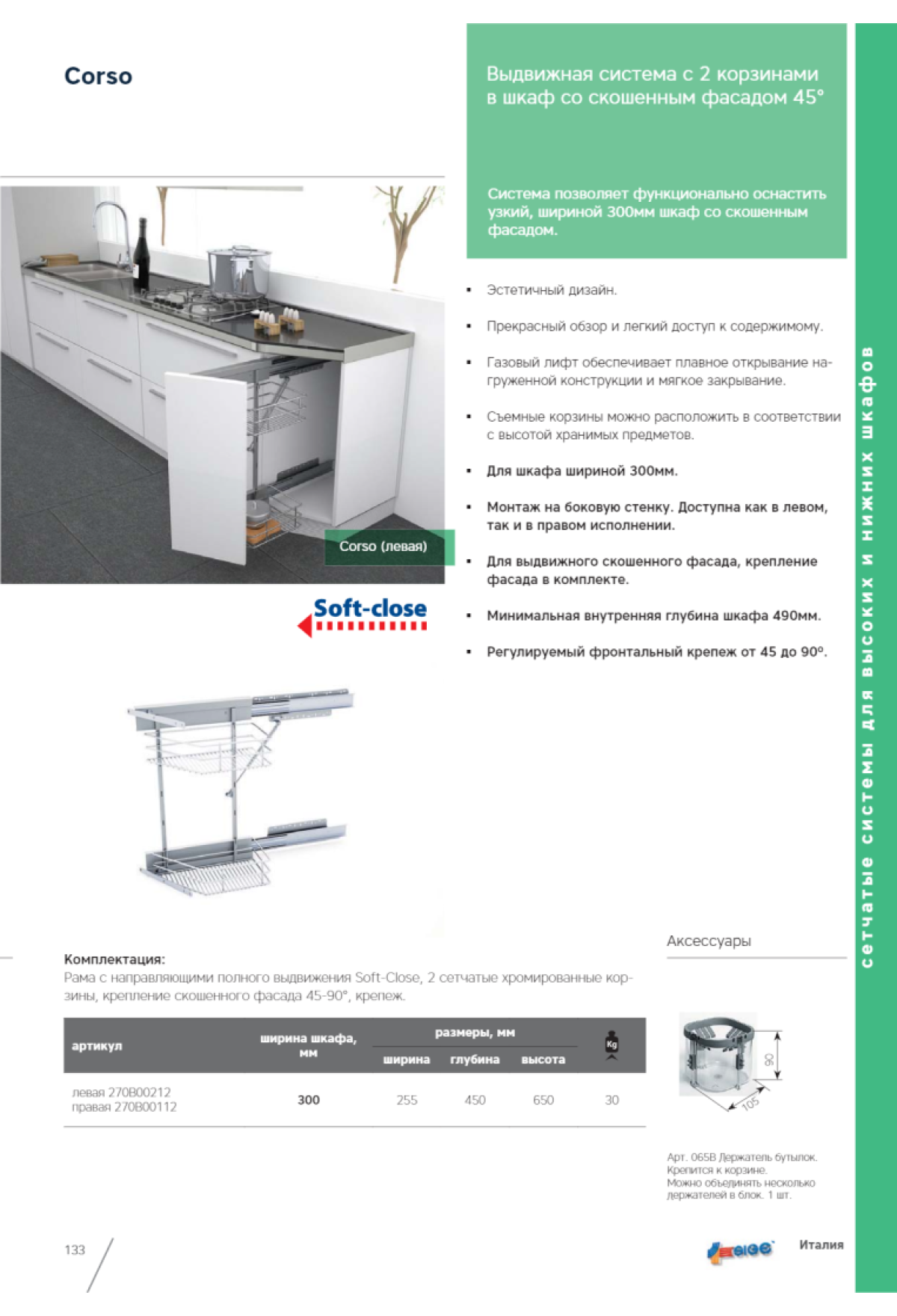 Технические характеристики корзина выдвижная 300мм SIGE CORSO с довод 255х450х650мм, правая/270B00112