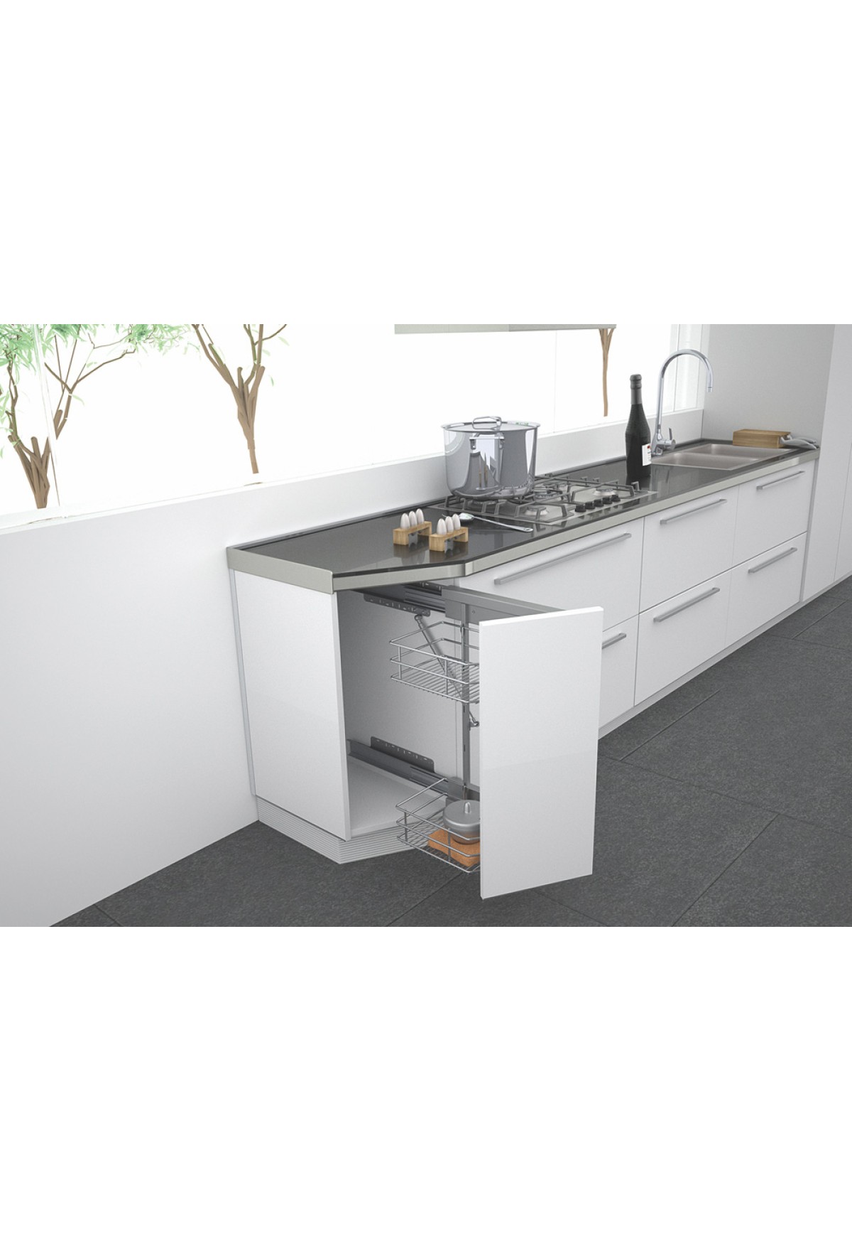 Функциональное оснащение шкафа со скошенным фасадом. Прекрасный обзор и легкий доступ к содержимому. Газовый лифт обеспечивает плавное открывание нагруженной конструкции и мягкое закрывание. Выдвижная система в шкаф 300мм со скошенным фасадом, правая.