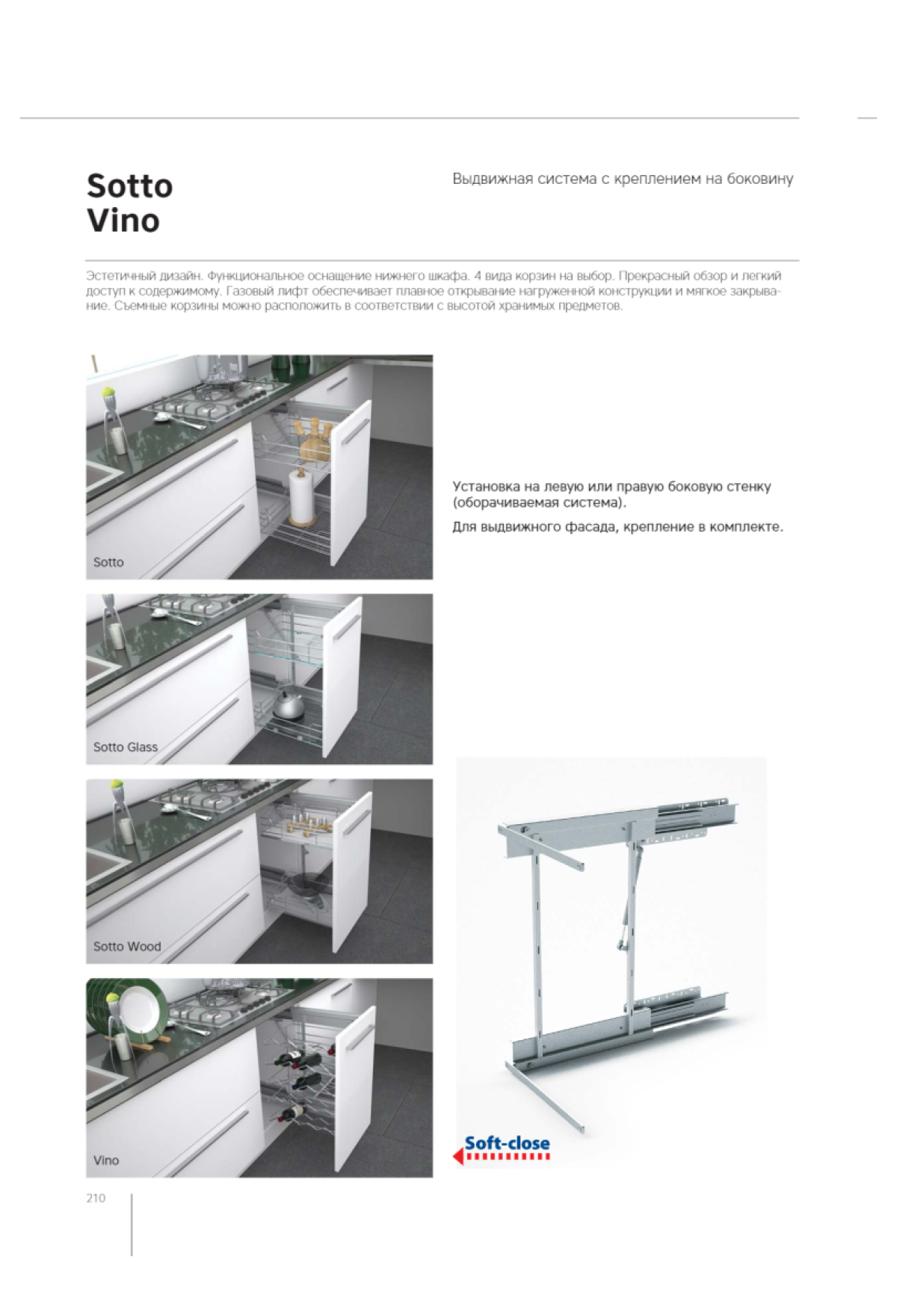 Функциональное оснащение нижнего шкафа. Полностью сетчатые корзины для хранения бутылок. Эстетичный дизайн. Прекрасный обзор и легкий доступ к содержимому. Газовый лифт обеспечивает плавное открывание нагруженной конструкции и мягкое закрывание. Съемные корзины можно расположить в соответствии с высотой хранимых предметов.
