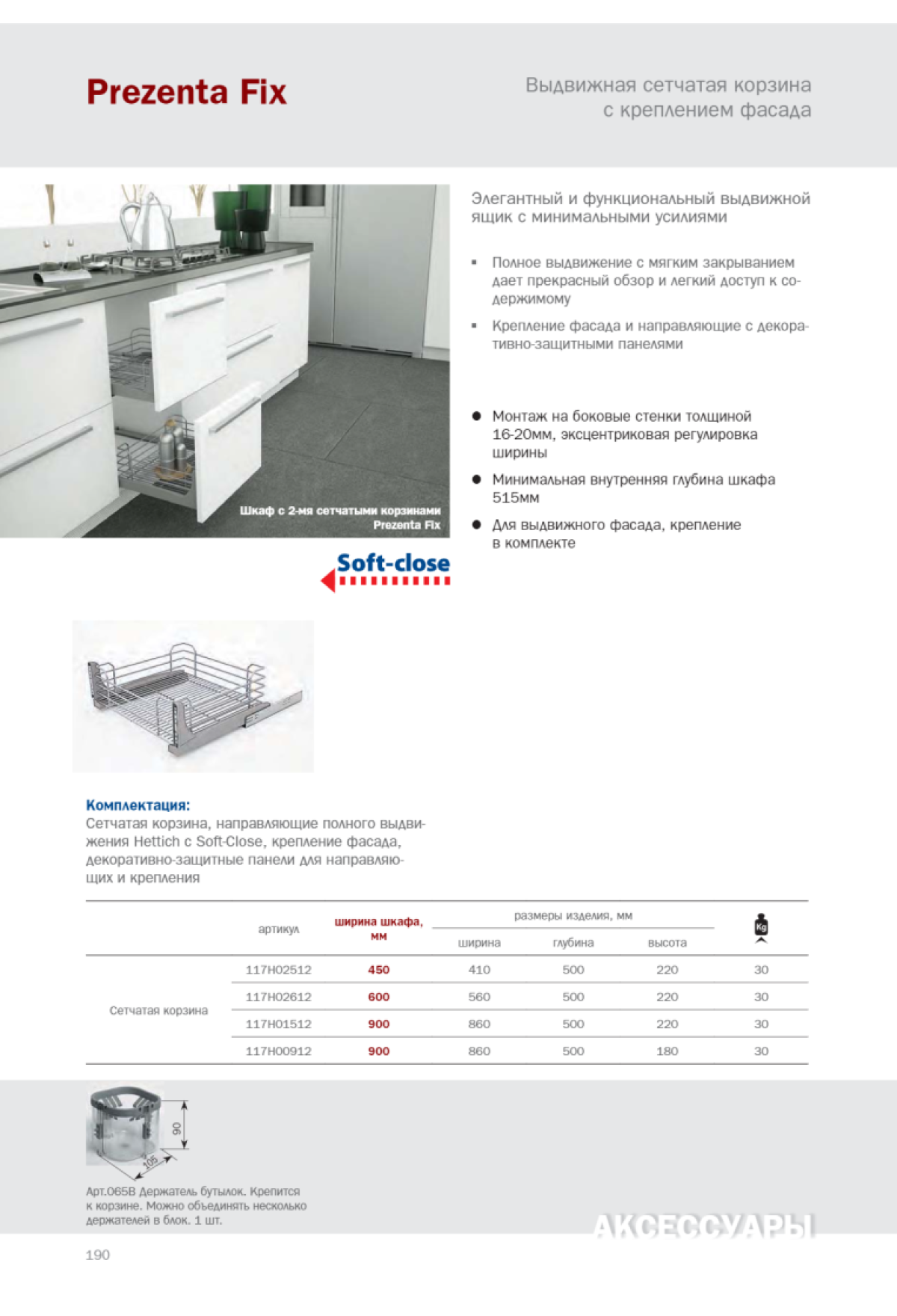 Технические характеристики корзина выдвижная 900мм SIGE PREZENTA FIX с доводчиком 864х500х180мм, хром /117H00912