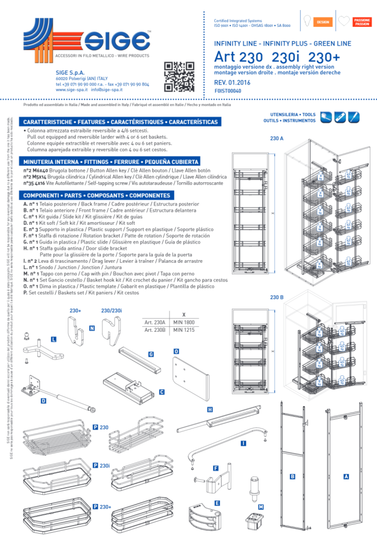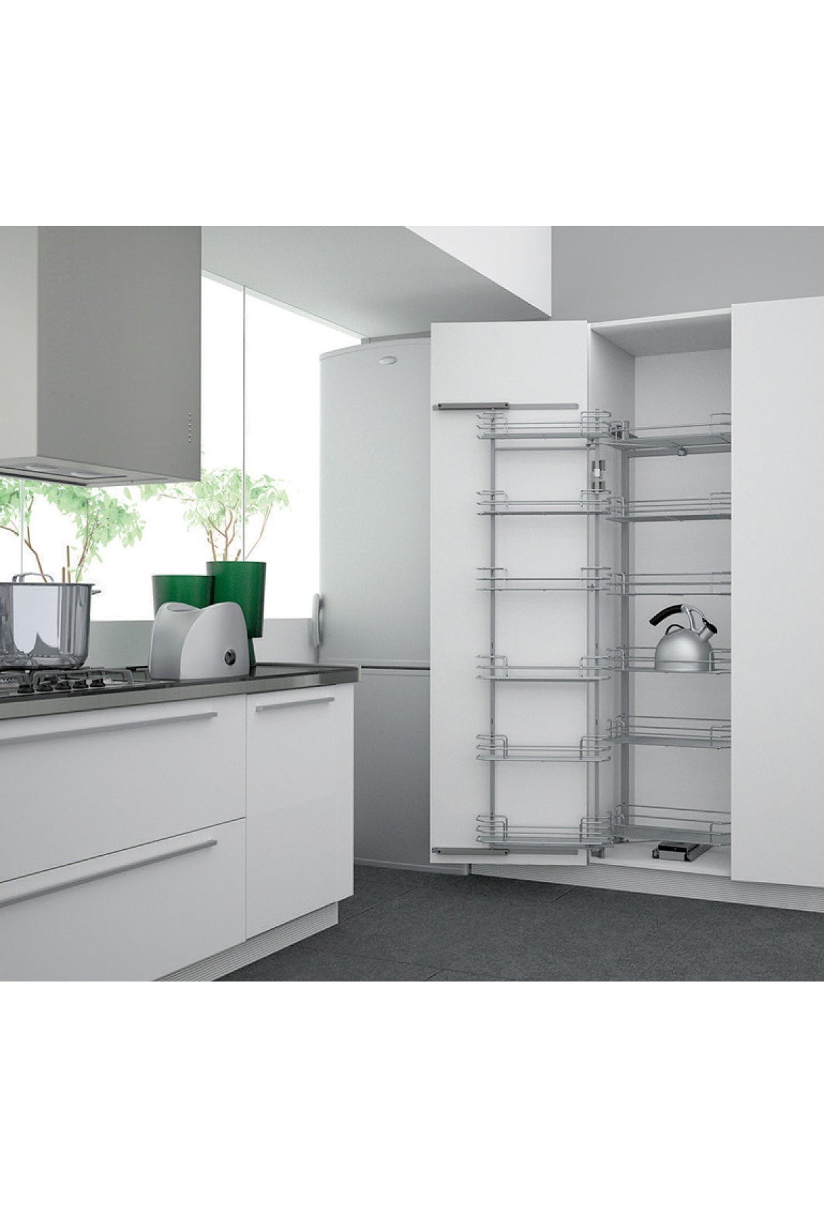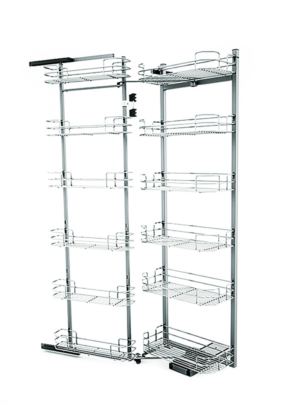 Комплектация:выдвижная система с регулировкой высоты встраивания от 1800мм, 12 корзин из хромированной стали, крепление.
