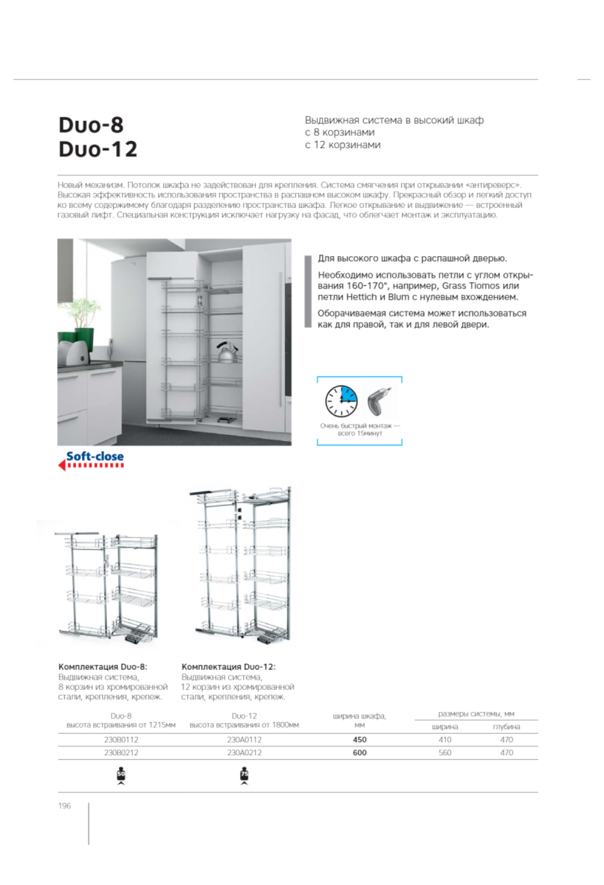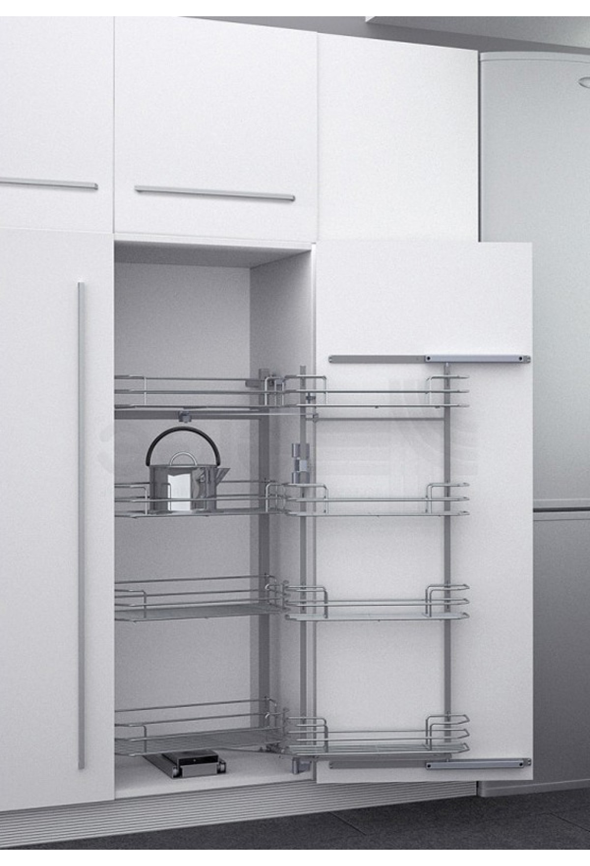 Самая высокая эффективность использования пространства в распашном высоком шкафу. Прекрасный обзор и легкий доступ ко всему содержимому благодаря разделению пространства шкафа. Очень легкое открывание и выдвижение - встроенный газовый лифт. Специальная конструкция исключает нагрузку на фасад, что облегчает эксплуатацию и продлевает срок службы мебели.