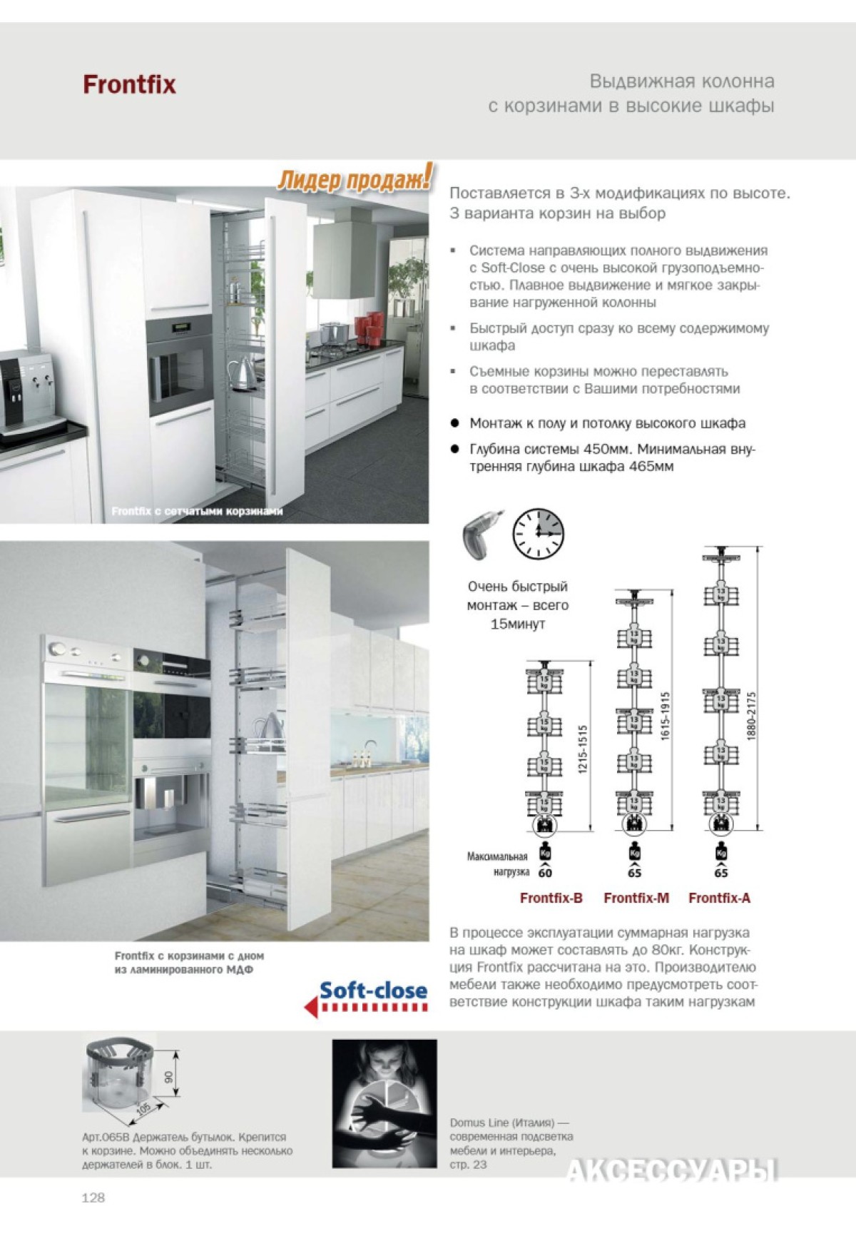 Комплектация:рама с регулировкой высоты 1880-2175мм, направляющие полного выдвижения с Soft-Close, 5 сетчатых корзин (круглый пруток) из хромированной стали, 3 крепления фасада, крепеж.