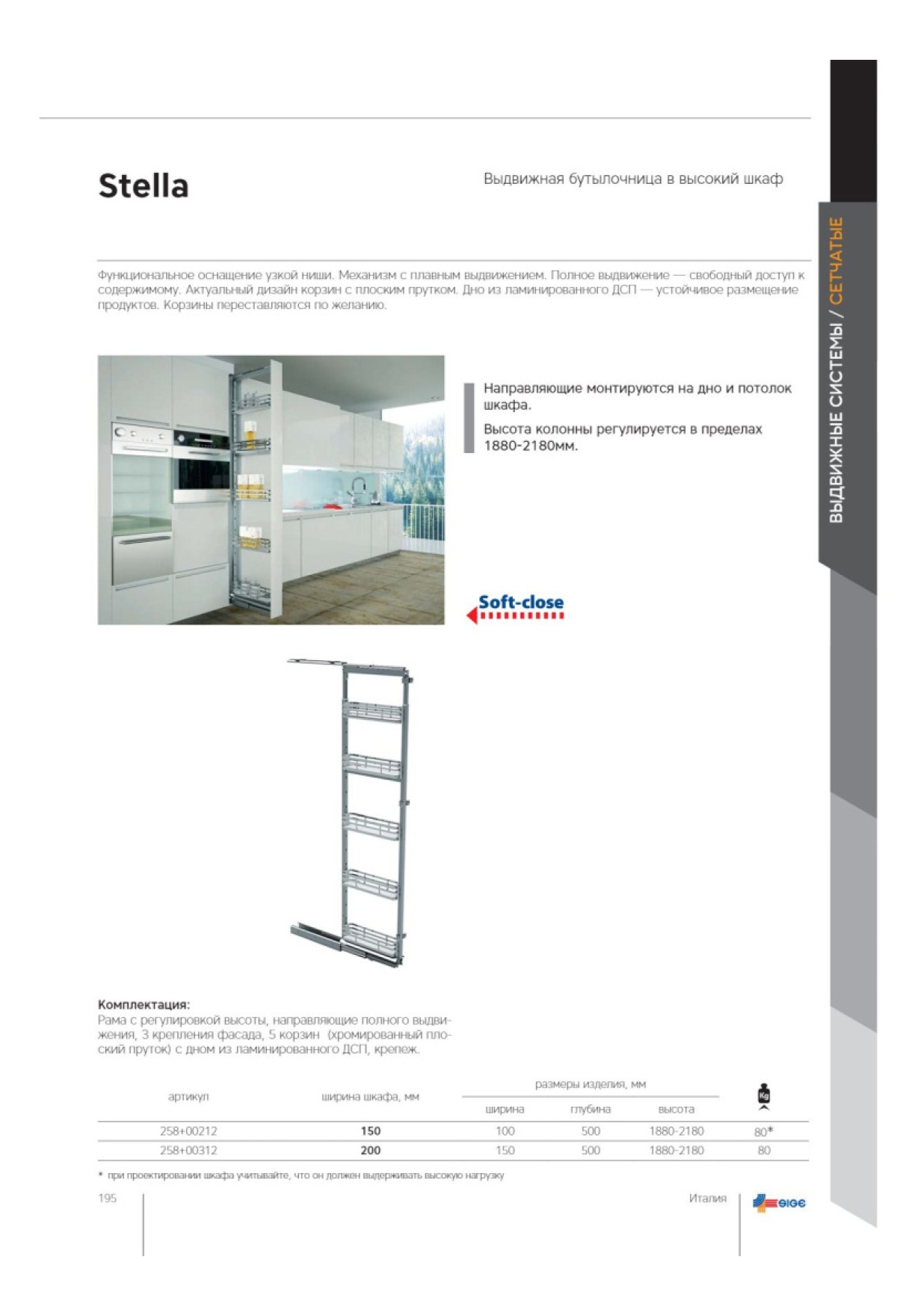 Технические характеристики пенал выдвижной SIGE STELLA в базу 150мм (1880-2180х100х505), доводчик,хром/258A00112