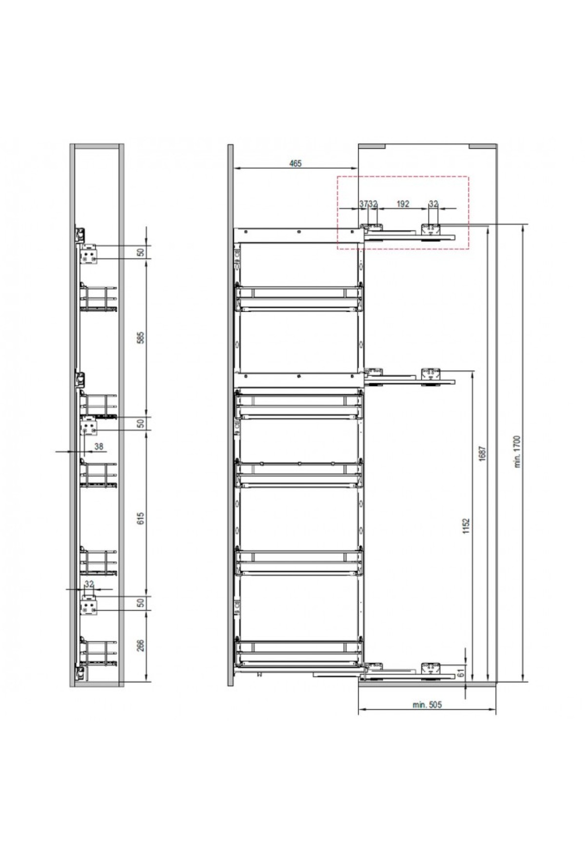 Технические характеристики пенал выдвижной в базу 150мм (150*465*1700мм), 5 яр, довод, правый, хром/белый WE27.5338.08.374