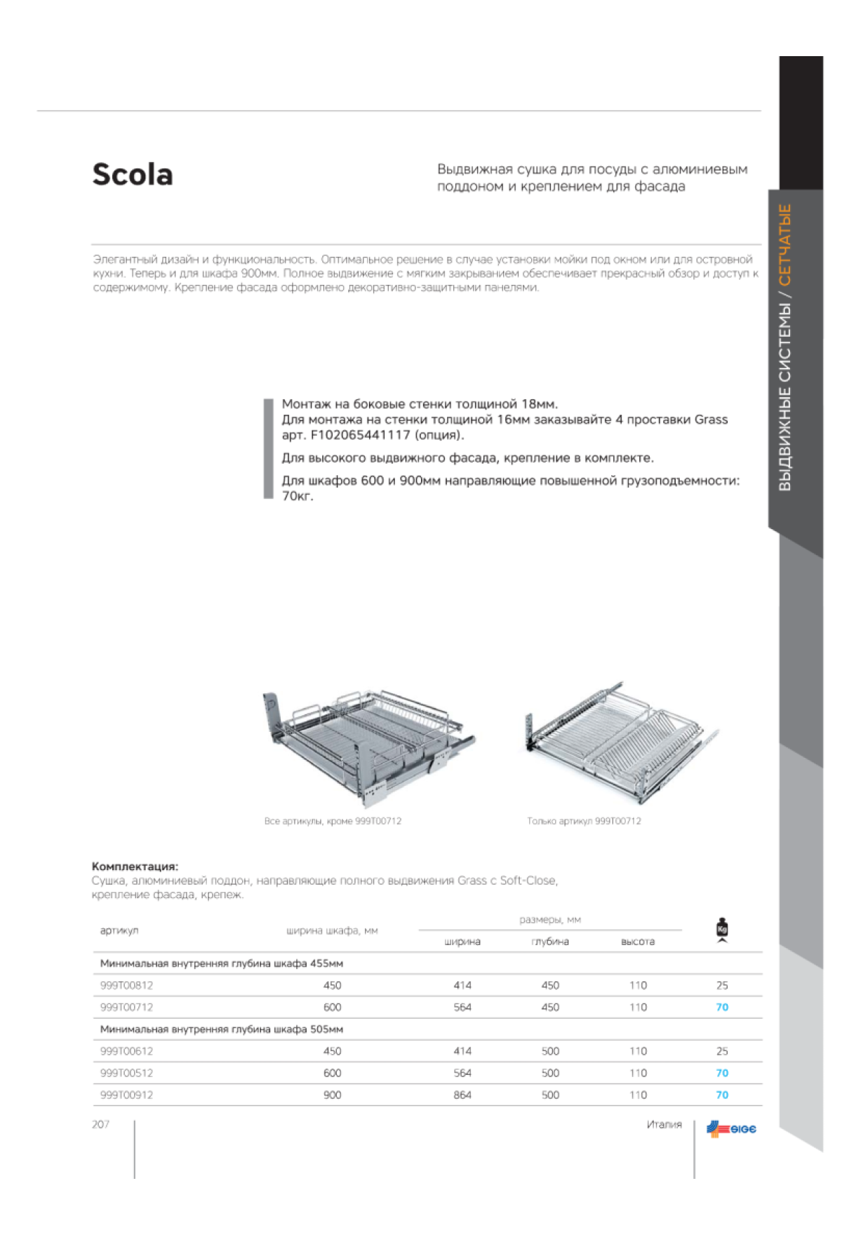 Технические характеристики посудосушитель в нижнюю базу SIGE SCOLA, 450мм (414*450*110), доводчик, поддон, хром/999T00812