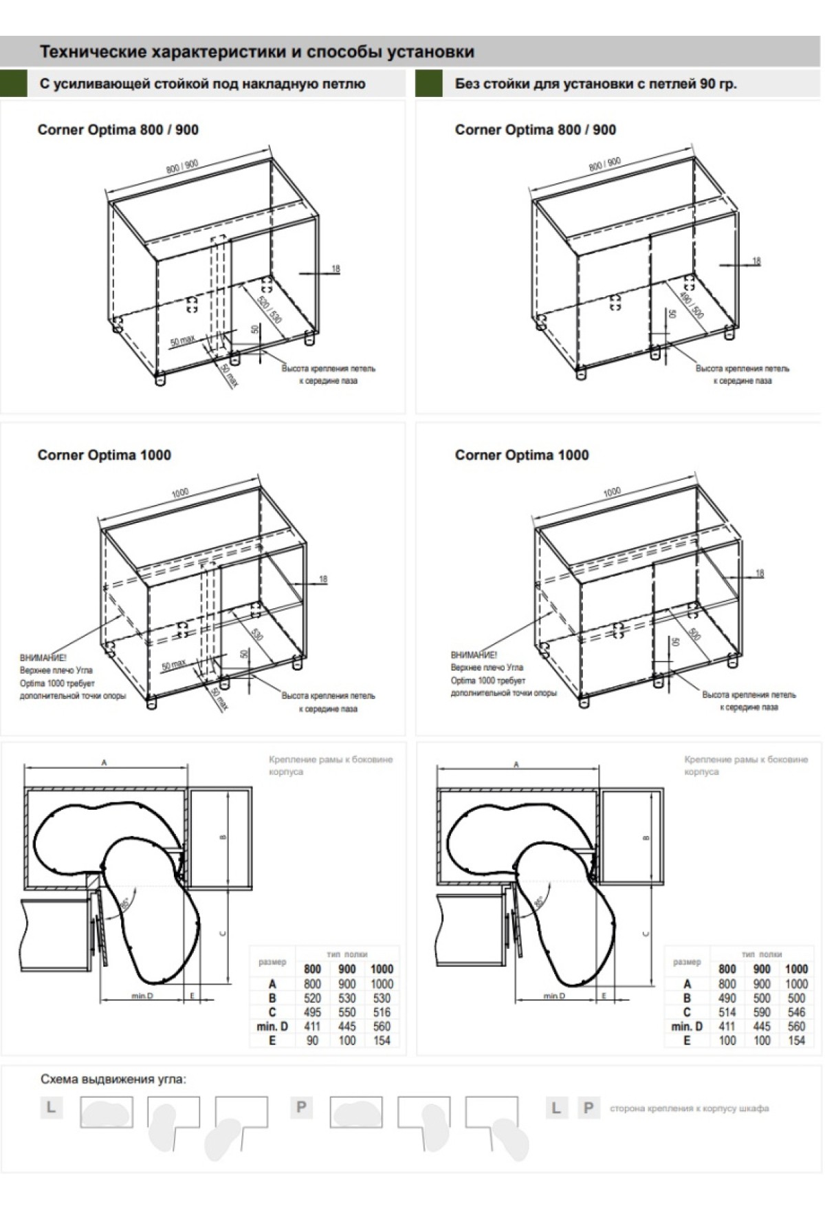 установка в угловой шкаф с фасадом на стандартных или угловых петлях