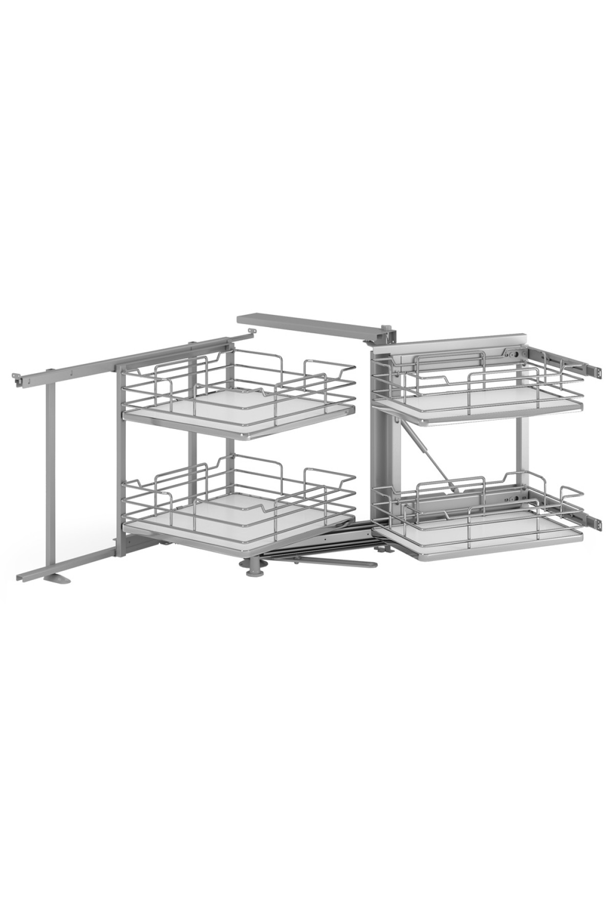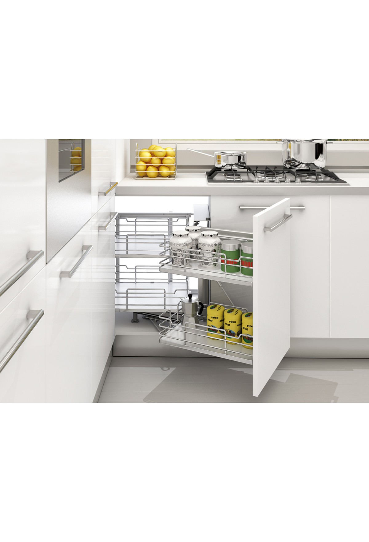 Комплектация: выдвижная система "волшебный уголок" с направляющими Soft-Close, 4 корзины (круглый пруток) с дном из ламинированного ДСП, универсальное крепление для фасада 450, 500, 600мм, ограничительный стопор, шаблон.