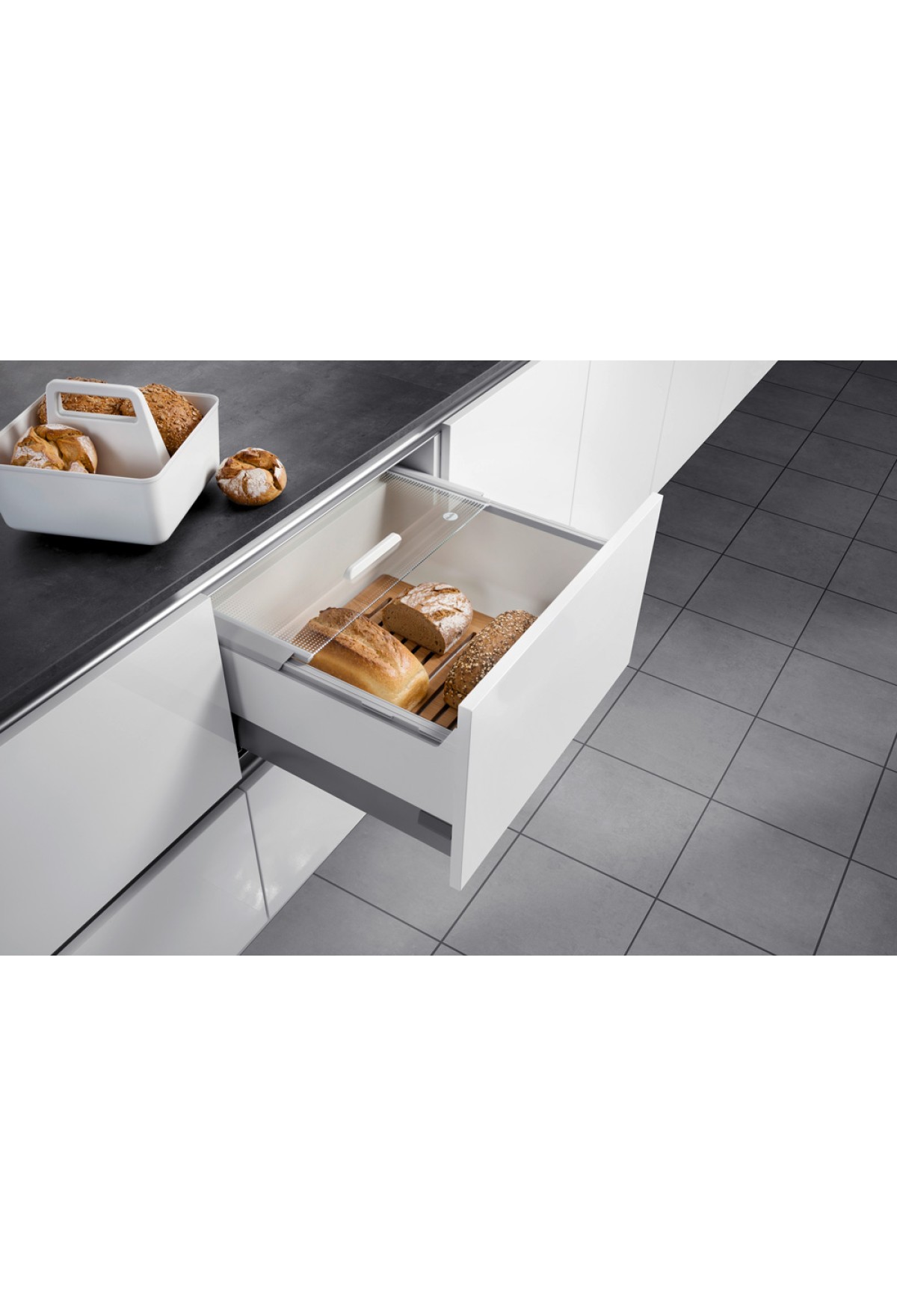 Красивый ящик со скользящей крышкой из закаленного стекла можно использовать в качестве хлебницы и не только. Деревянная рещетка для правильного хранения хлеба, пластиковая - для чистых овощей или других продуктов, которые хранятся при комнатной температуре. Очень легко устанавливается.