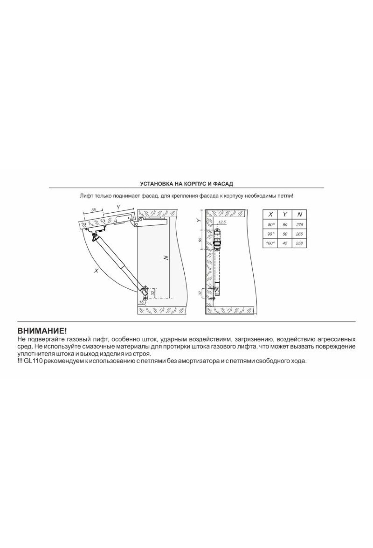 OZON GL110 — газовый лифт для фрикционного открывания фасада вверх, оснащён встроенным амортизатором для плавного и бесшумного закрывания с удобного угла, который возможно настроить под себя. Лаконичный монодизайн, образуемый защитно-декоративным стальным чехлом, скрывает спицу газлифта. Крепёж в тон держателям из комплекта остаётся практически незаметен. GL110 предназначен для корпусной мебели жилых помещений, в том числе офисных, но транспортировка допускается при низких и высоких температурах (-35°C – +70°C.). Компактная форма, монодизайн без видимых внутренних механизмов смотрится в мебели современно и лаконично. GL110 рекомендуется устанавливать в комбинации с петлями BOYARD без амортизатора или петлями свободного хода.
