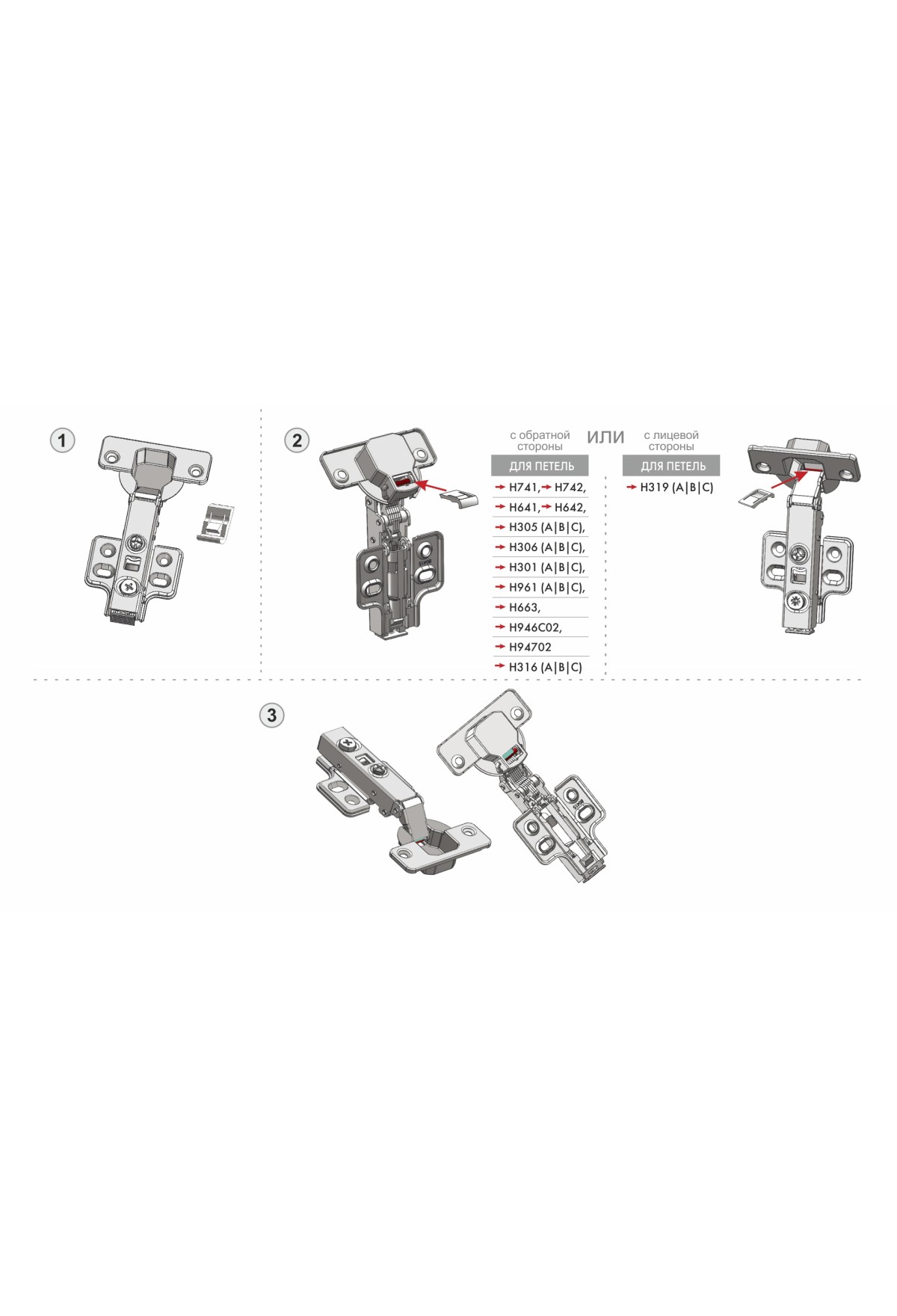!!!Ограничитель H87 невозможно установить в модели петель H740, Н640 ввиду особенностей конструкции петель.