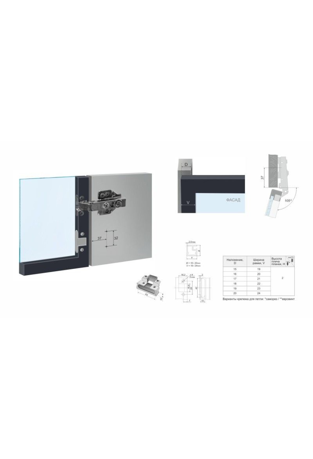 Модель быстрого монтажа Clip-on, имеет регулировку фасада в трёх плоскостях (по глубине, горизонтали и вертикали). Удобная регулировка по высоте и глубине в одно действие осуществляется при помощи эксцентрикового винта, встроенного в корпус петли. Регулировка фасада по горизонтали доступна при помощи винтов на планке.