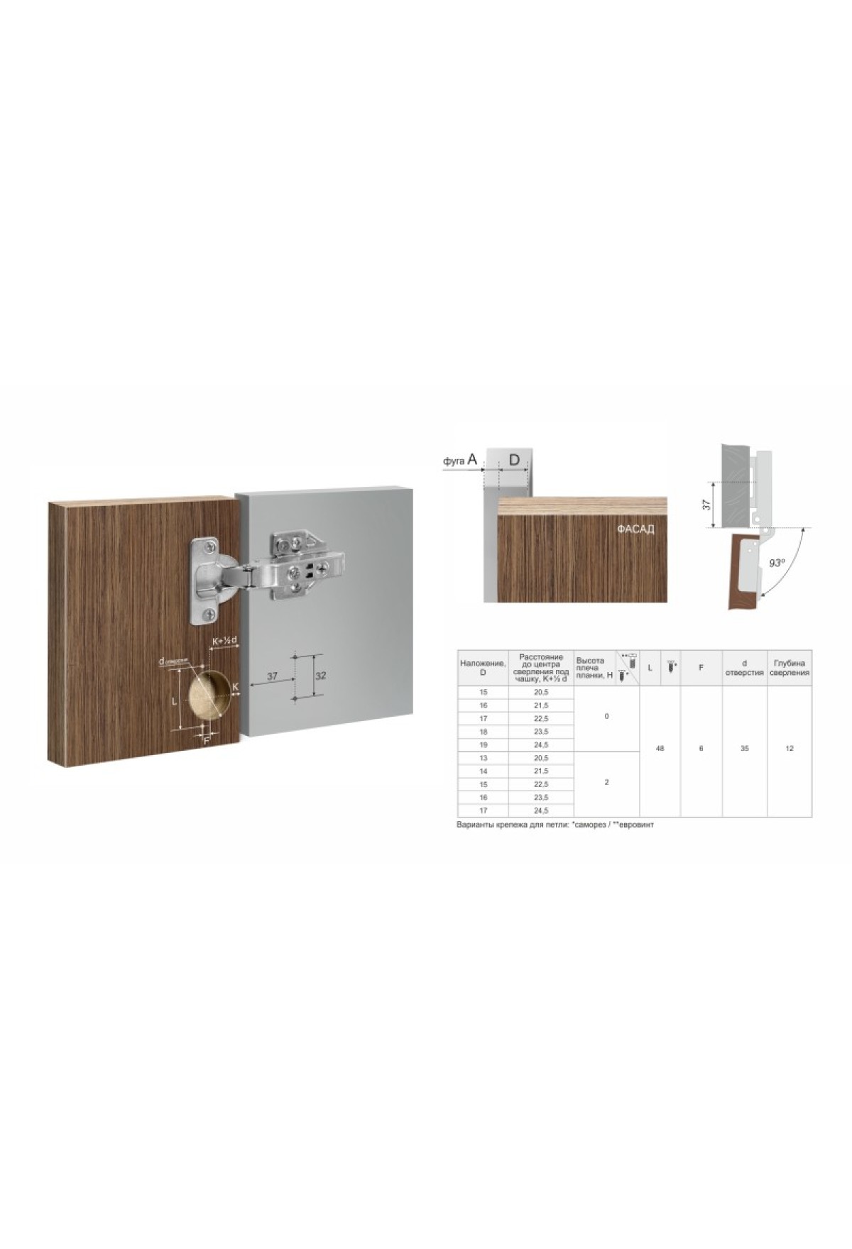 Крепёж для монтажа петель EVO подбирается самостоятельно.Для более прочного соединения с плитой при креплении петель и ответных планок саморезами рекомендуется использовать футорки.