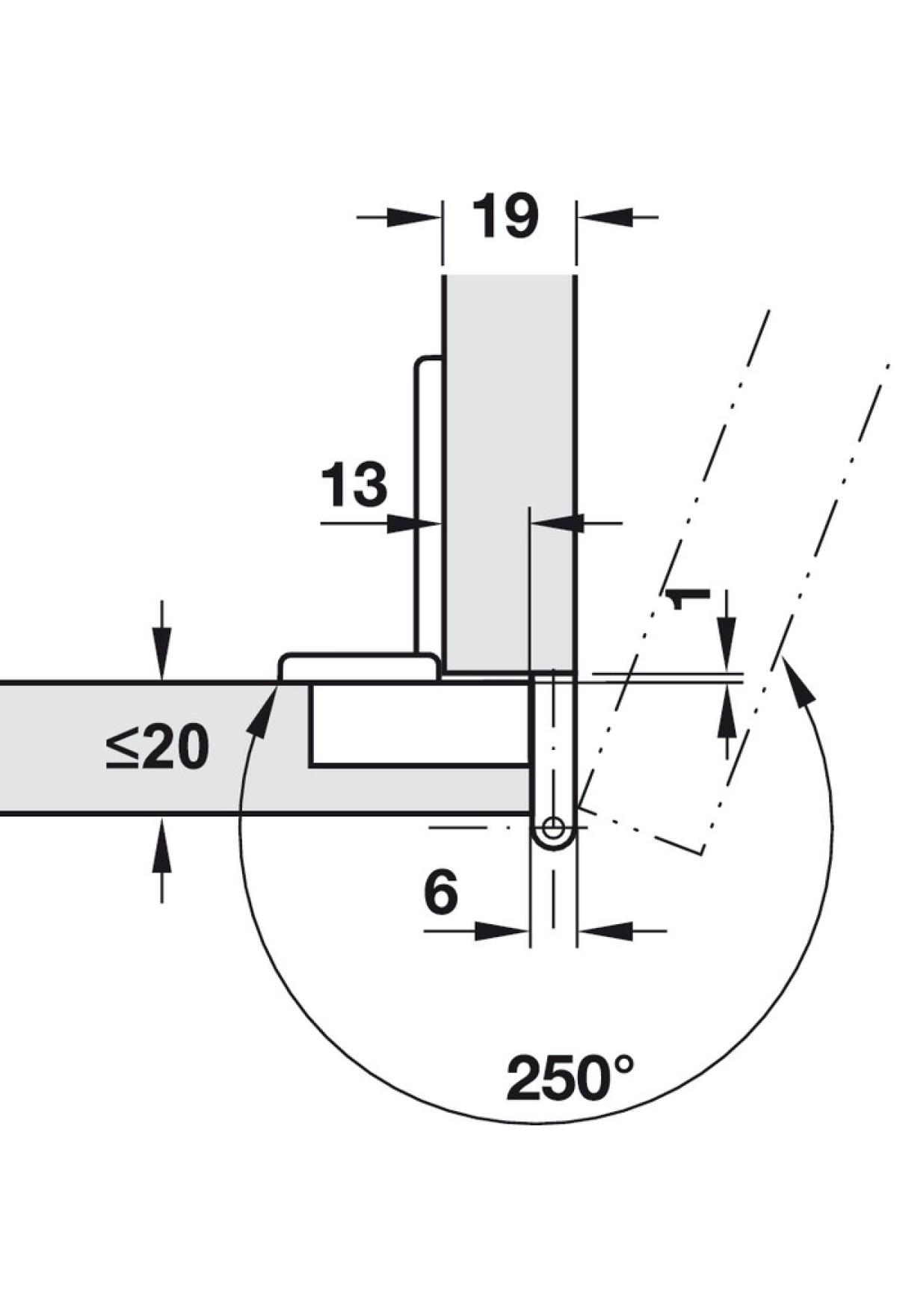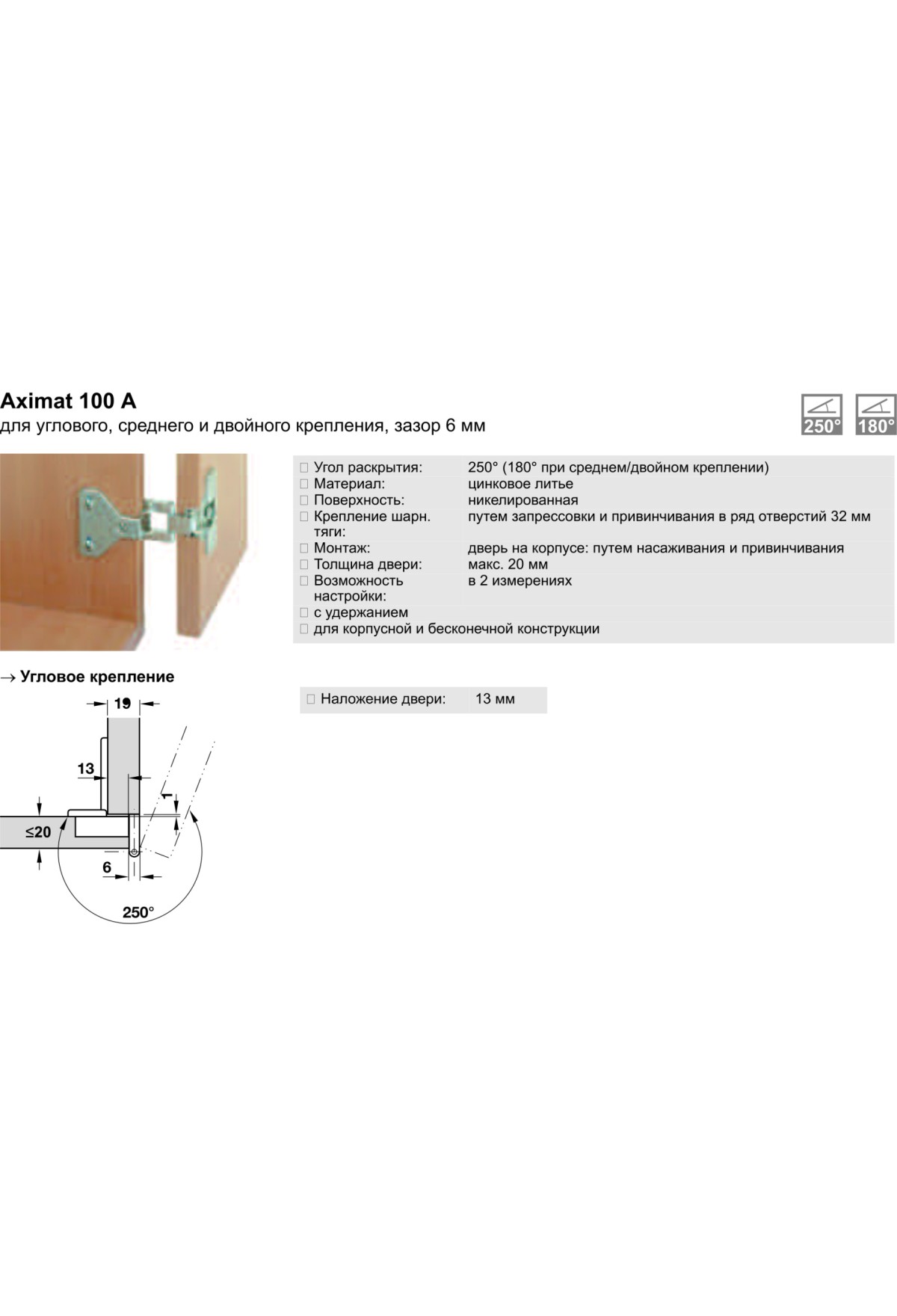 Технические характеристики Петля мебельная Aximat 250 градусов под прикручивание Hafele