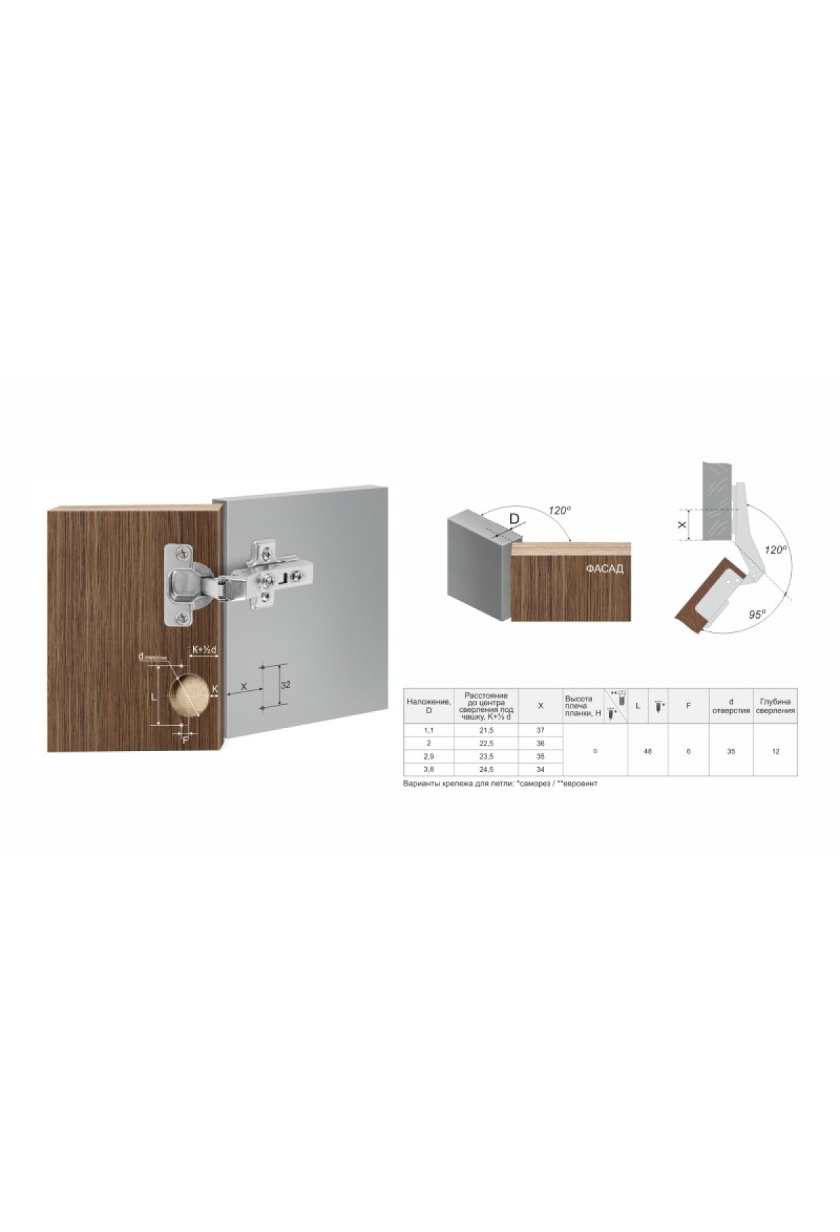 H621A02/1810 - одноходовая мебельная петля быстрого монтажа с амортизатором и углом установки 120°. Обеспечит плавное и мягкое открывание/закрывание фасада одним движением. Предназначена для надежного крепления накладных фасадов из плитных материалов.