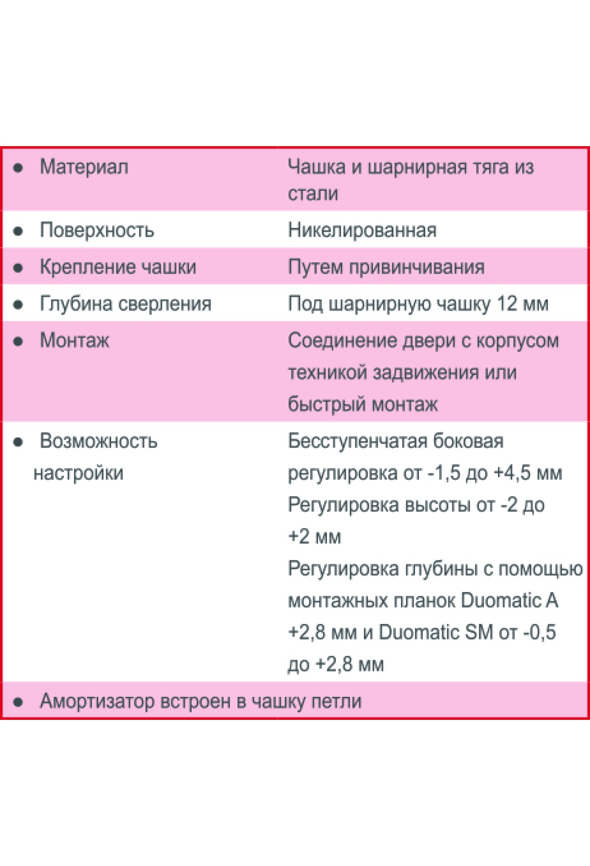 Технические характеристики Петля мебельная вкладная Duomatic Premium 105 градусов с доводчиком 329.28.703 Hafele