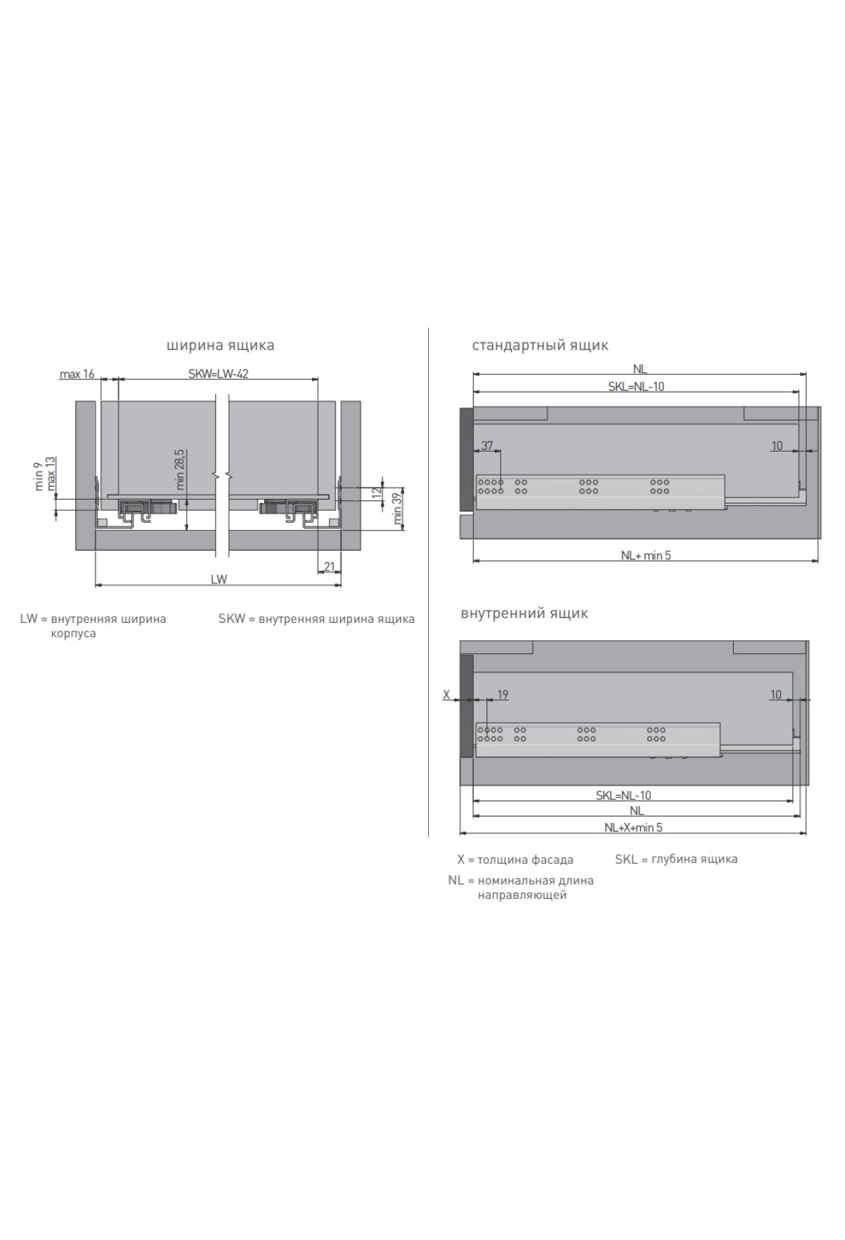 Характерная особенность направляющих MODERN SLIDE - скрытый монтаж, когда их установка осуществляется не на боковины ящика, а под его дно.