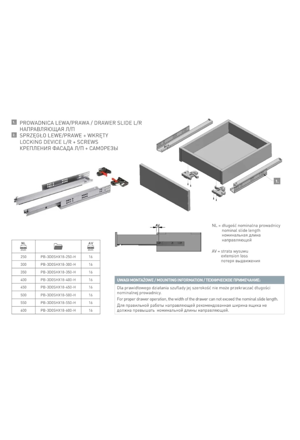 Технические характеристики Направляющие скрытого надвижного монтажа полного выдвижения с доводчиком 550мм MODERN SLIDE 3D PB-3D0SHX18-550-H GTV