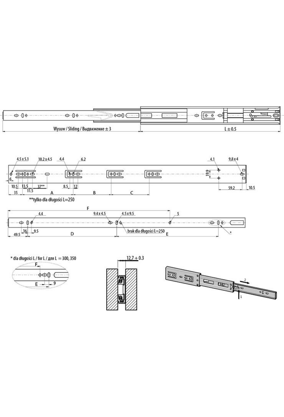 Технические характеристики Направляющие шариковые частичного выдвижения с доводчиком 45*250мм PK-L-H45-250 GTV