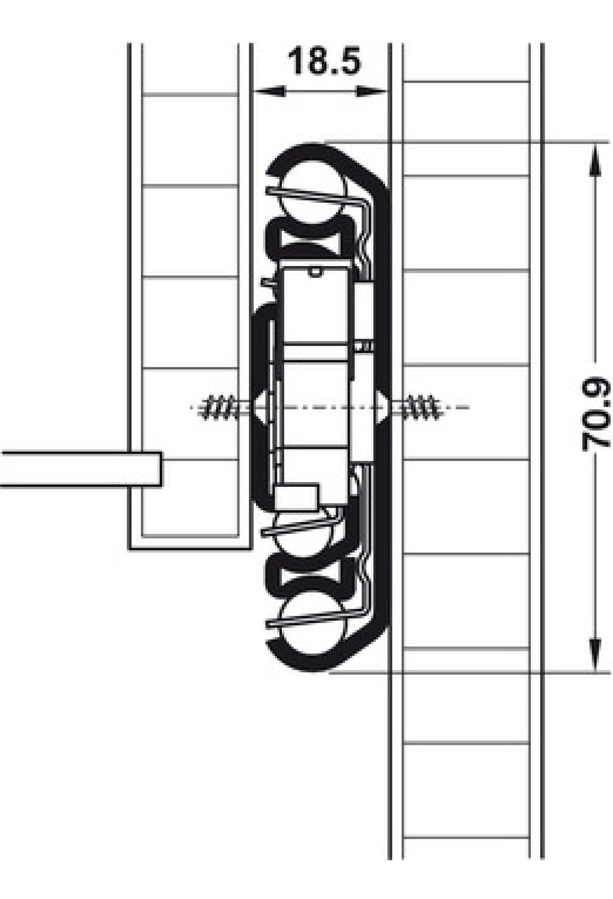 Монтажный размер между боковой стойкой корпуса и боковиной выдвижного ящика: 18,5 мм.