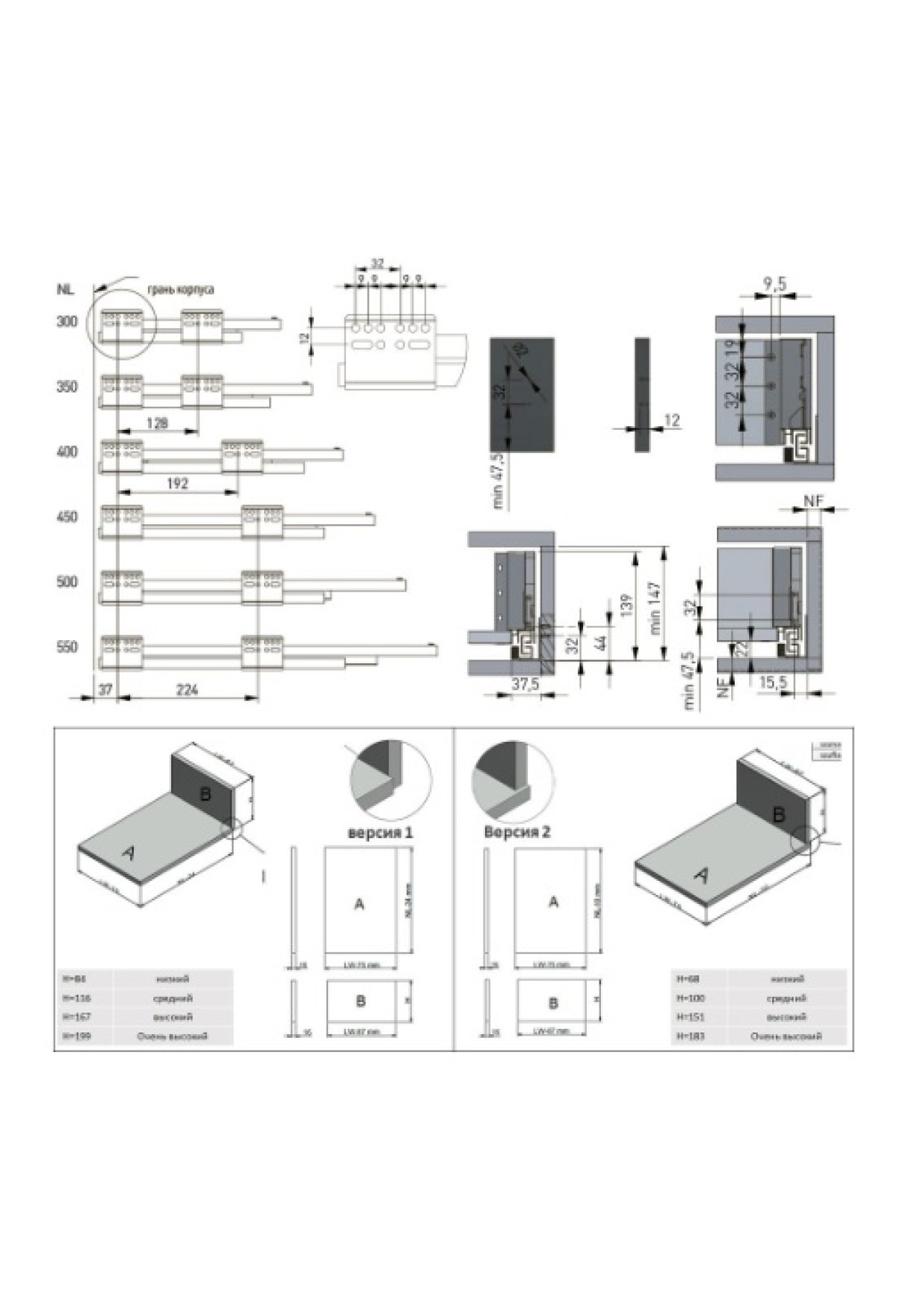 Регулировка фасада в вертикальной (+/- 2 мм) и горизонтальной (+/- 2 мм) плоскостях.