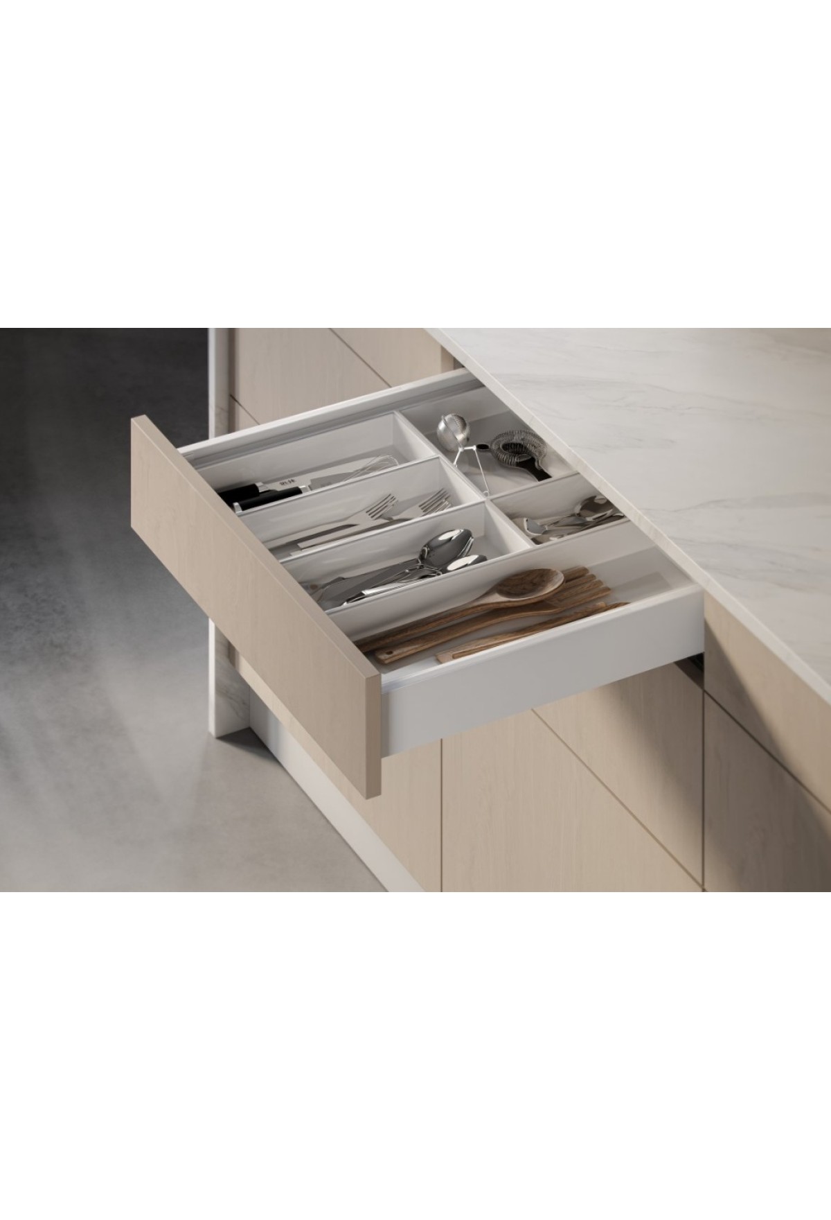 Максимальная вместимость ящика, достигнутая посредством нижнего монтажа направляющих и минимальной толщины боковых панелей.