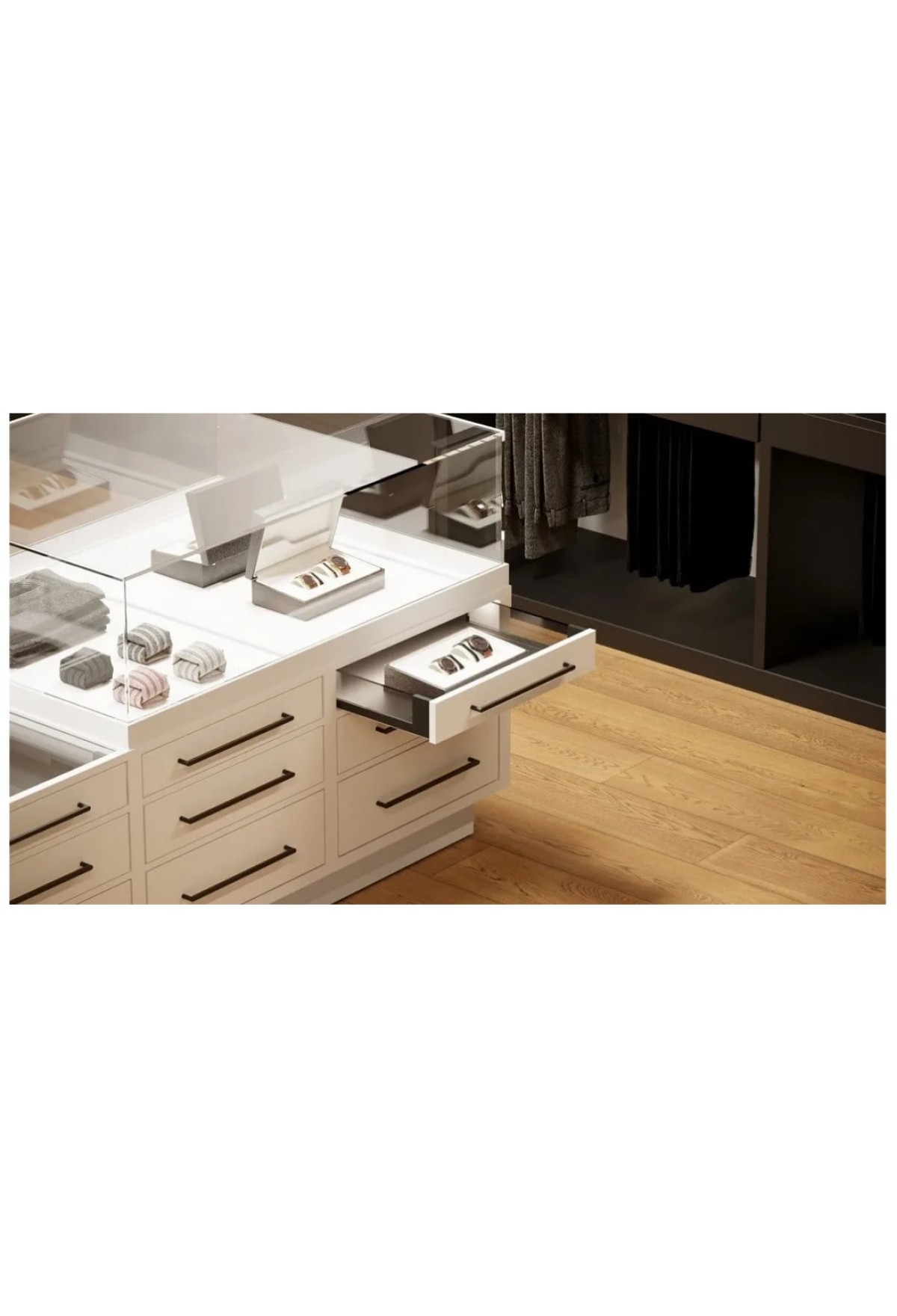 В первую очередь данная система предназначена для гардеробных, но также может использоваться в ванных комнатах и в кухонных помещениях.