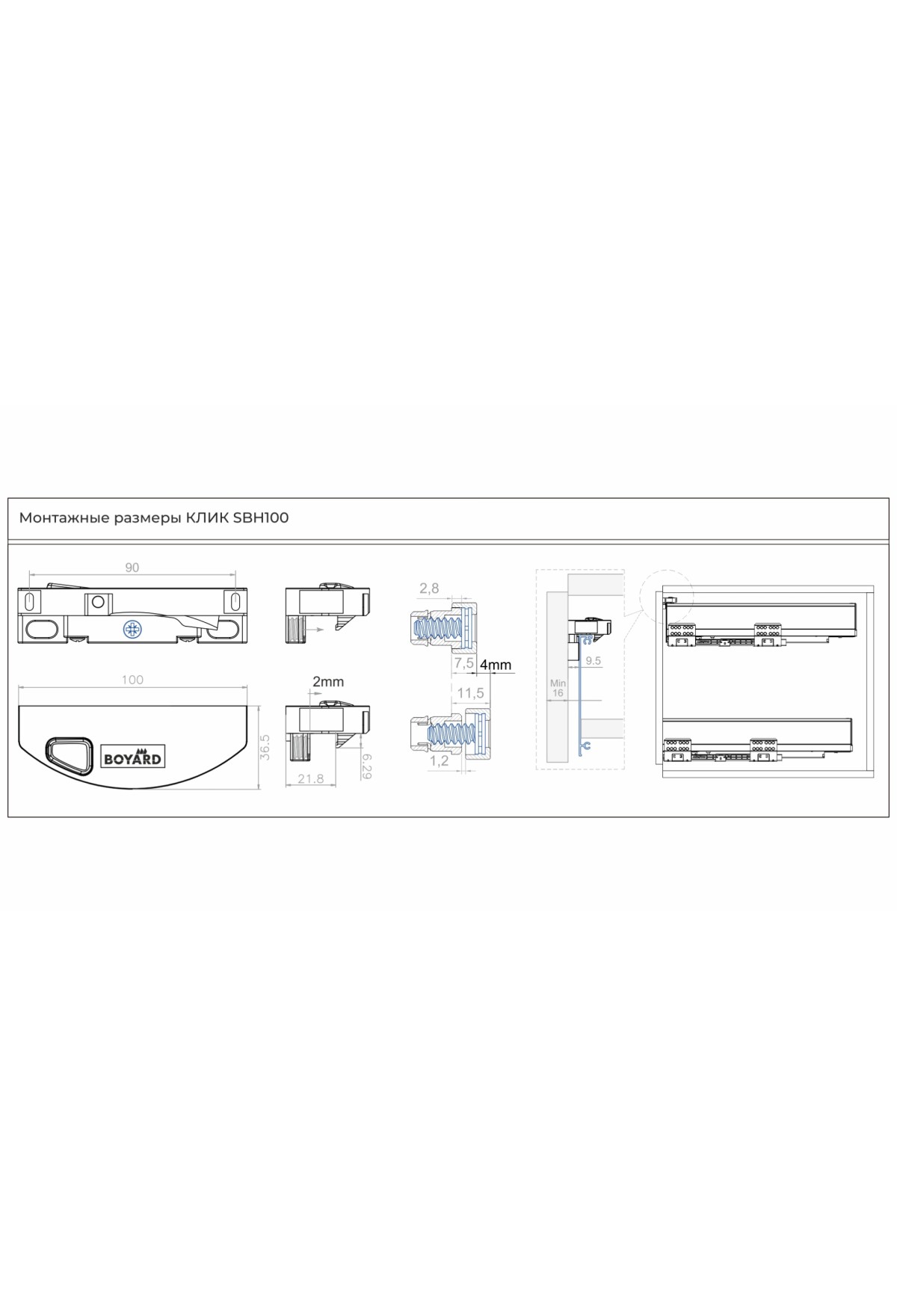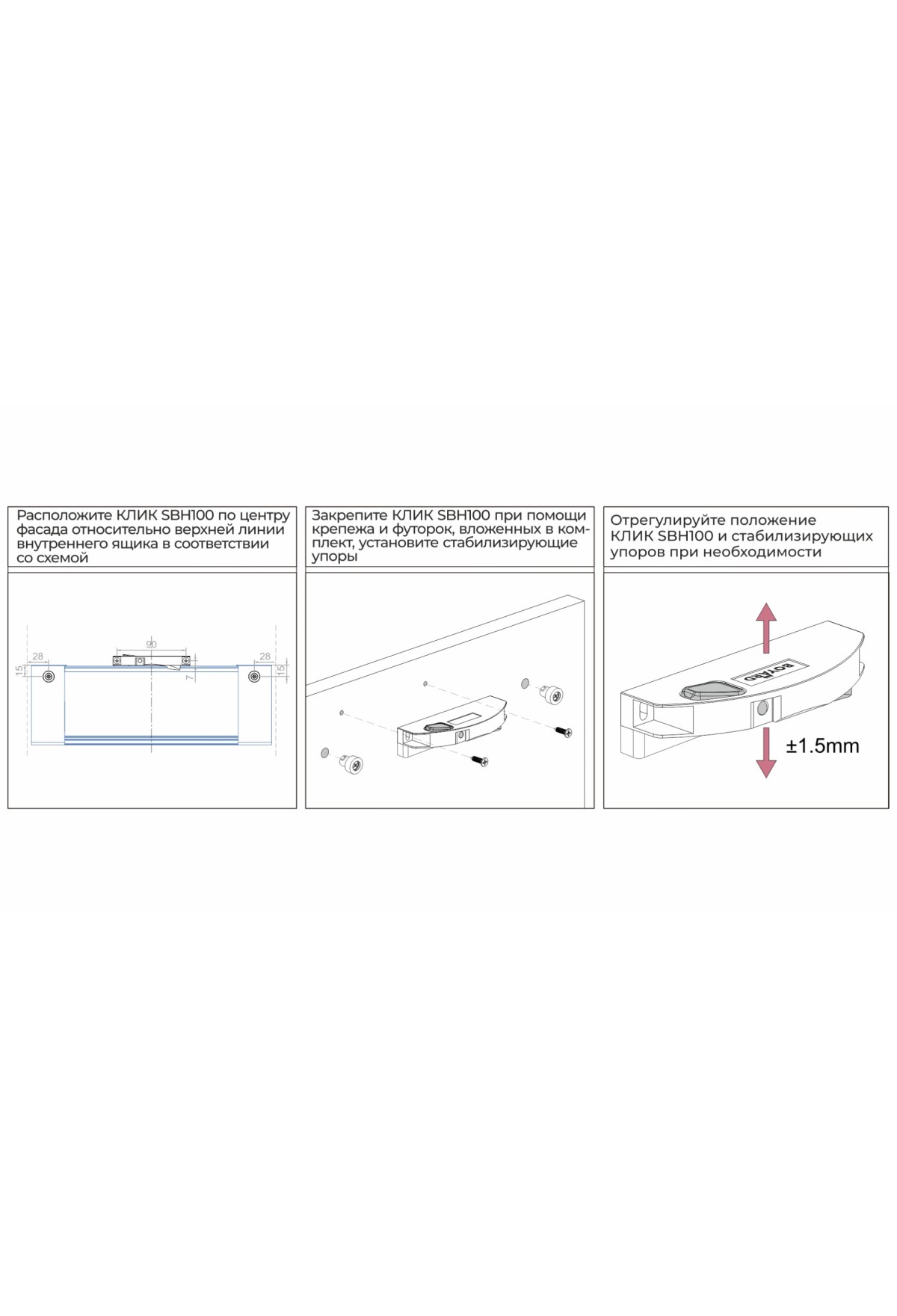 КЛИК SBH100 в своей конструкции имеет специальный «усик», создающий небольшой преднатяг, препятствующий сильному столкновению внутреннего ящика с фасадом основного ящика.