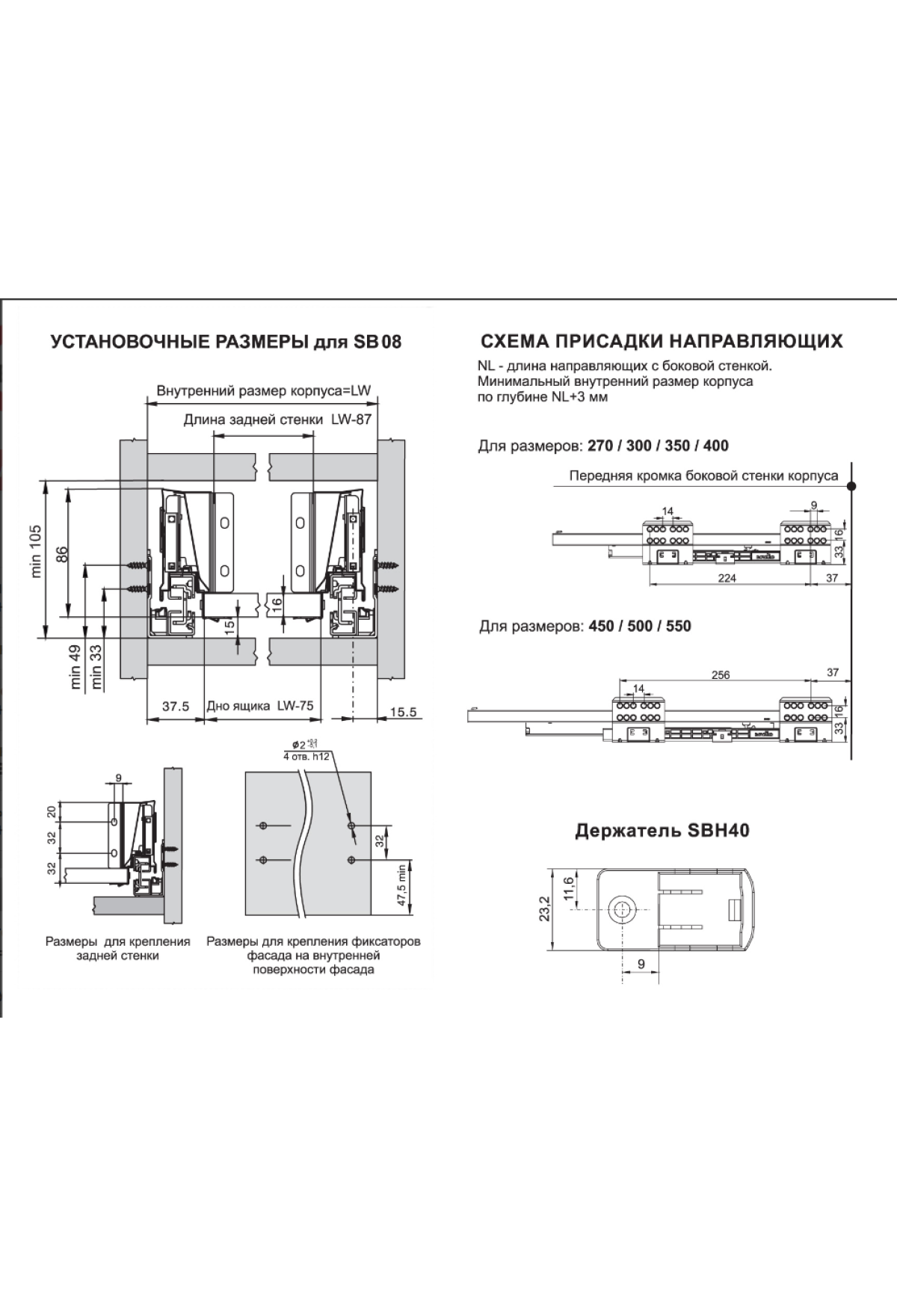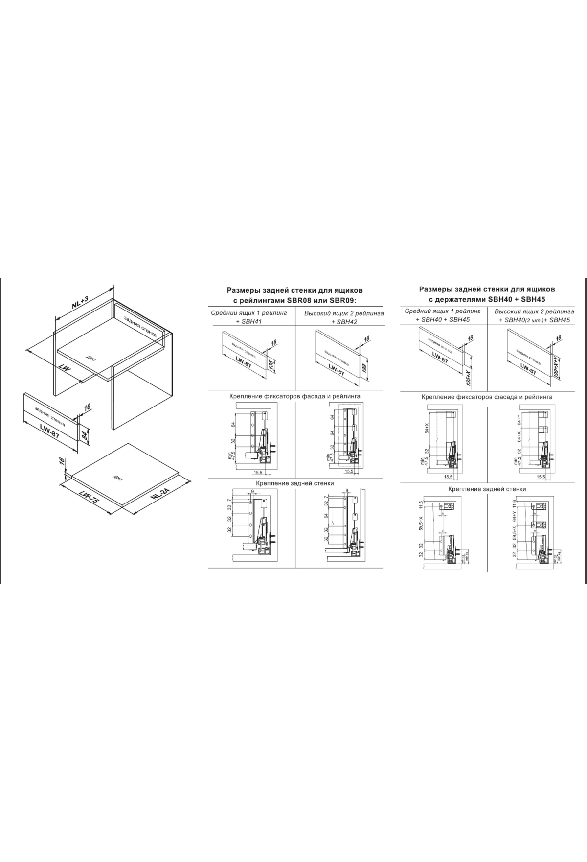Применяется с держателями рейлинга SBH40 и держателями задней стенки SBH45 для формирования выдвижного мебельного ящика любой высоты, а также с держателями задней стенки SBH41 и SBH42 для формирования средних и высоких выдвижных ящиков.