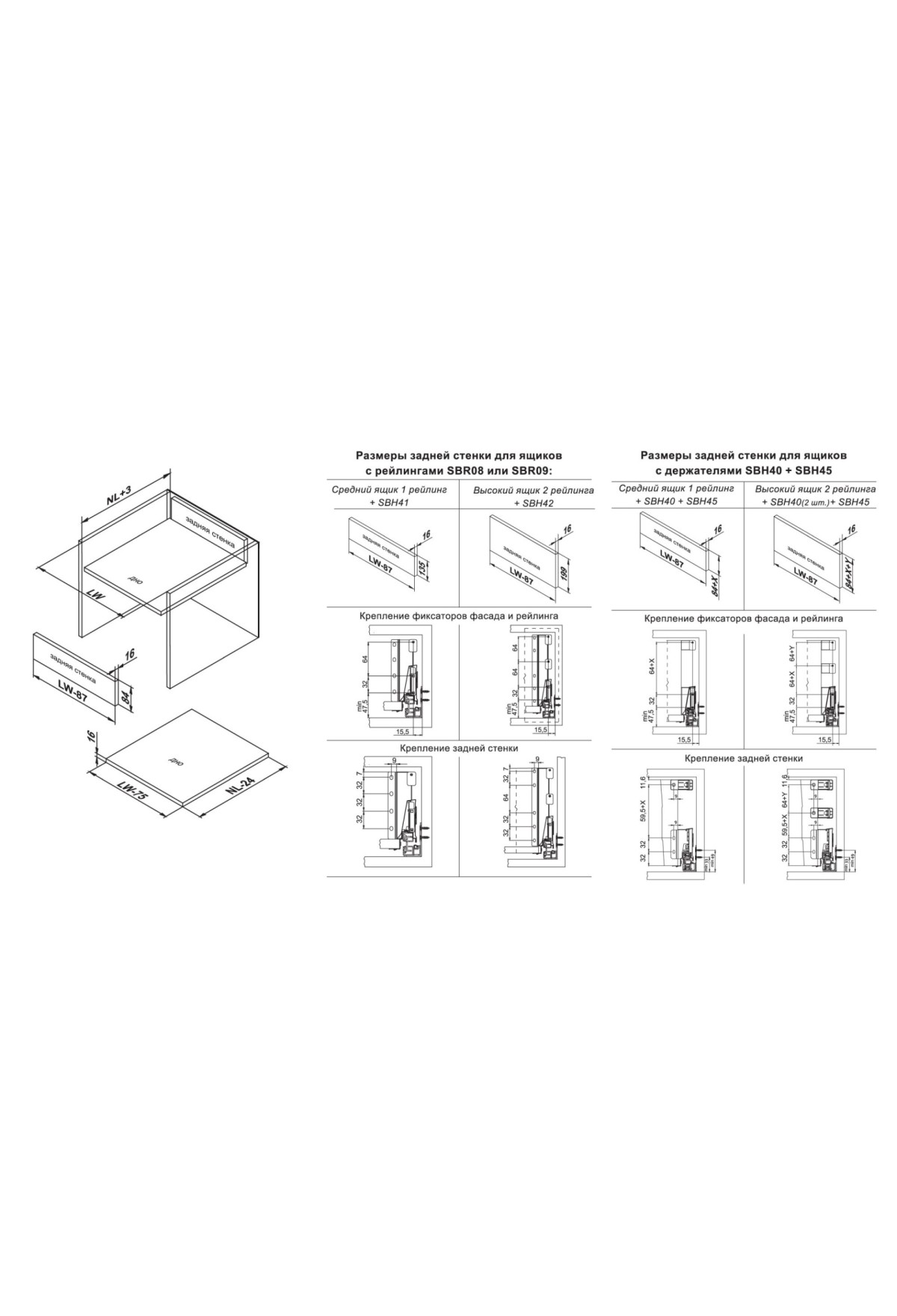 Применяется с держателями рейлинга SBH40 и держателями задней стенки SBH45 для формирования выдвижного мебельного ящика любой высоты, а также с держателями задней стенки SBH41 и SBH42 для формирования средних и высоких выдвижных ящиков.
