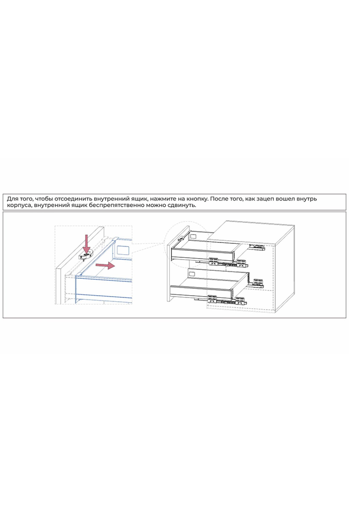 Держатель легко закрепляется на саморезы (идут в комплекте держателем) с обратной стороны фасада, и надёжно фиксирует внутренний ящик, а одним нажатием кнопки отпускает его.