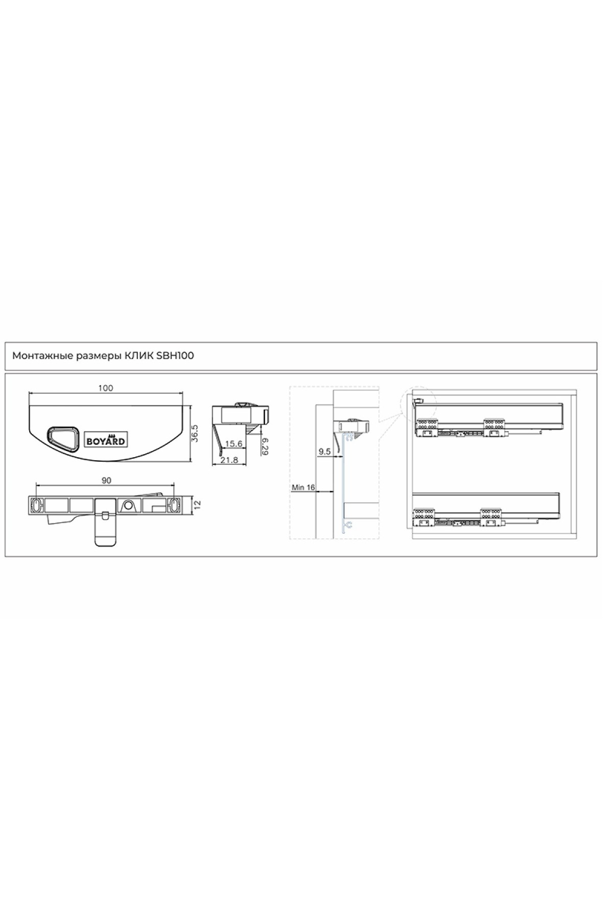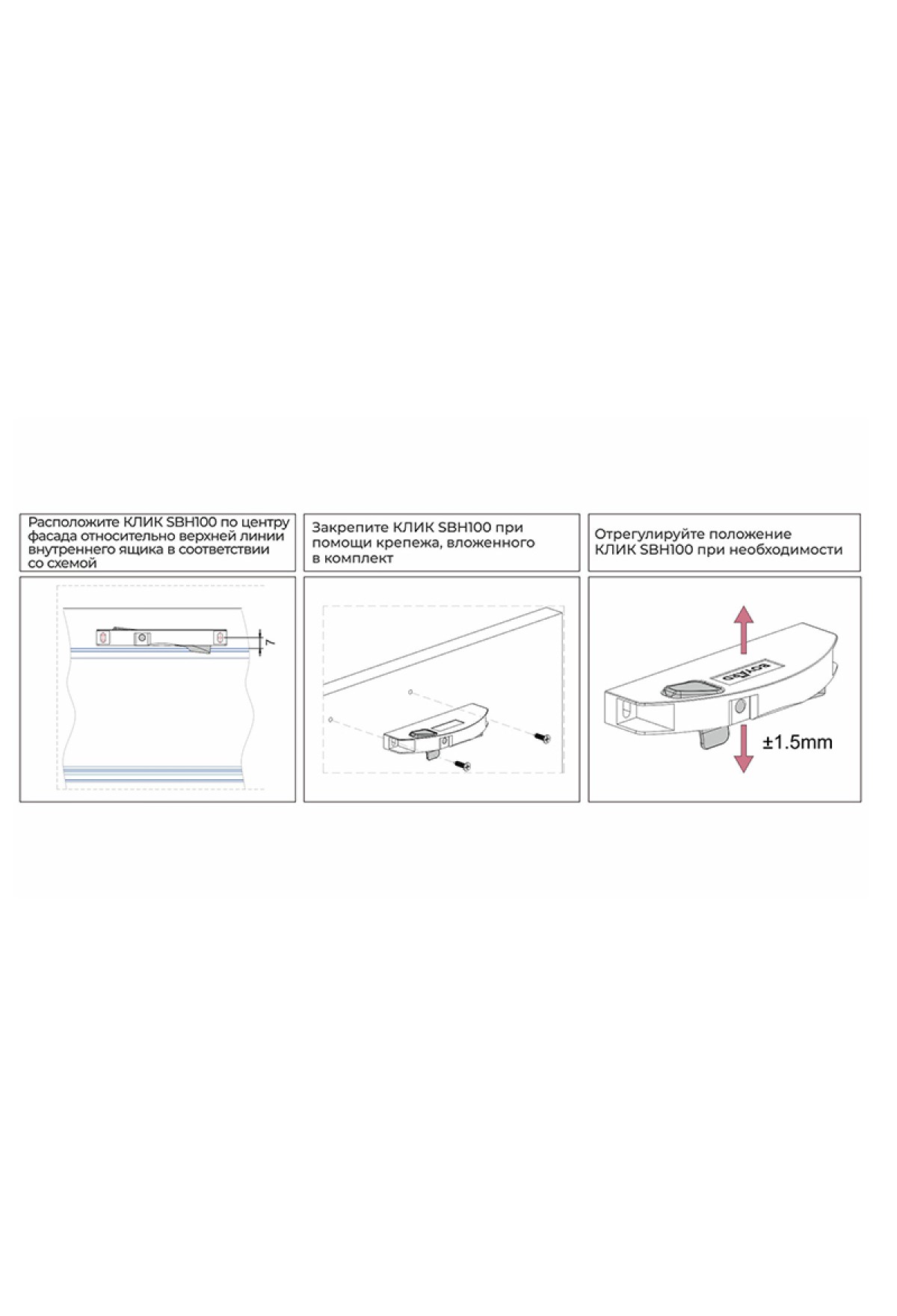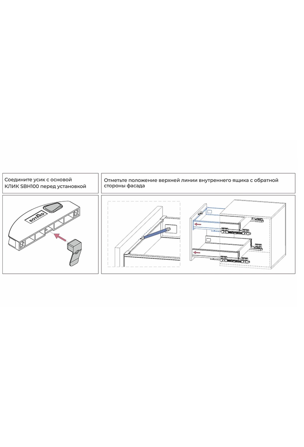 КЛИК SBH100 в своей конструкции имеет специальный «усик», создающий небольшой преднатяг, препятствующий сильному столкновению внутреннего ящика с фасадом основного ящика.