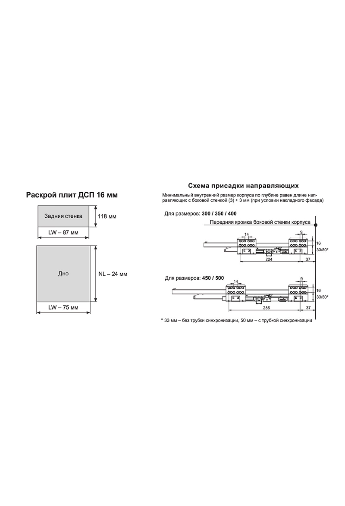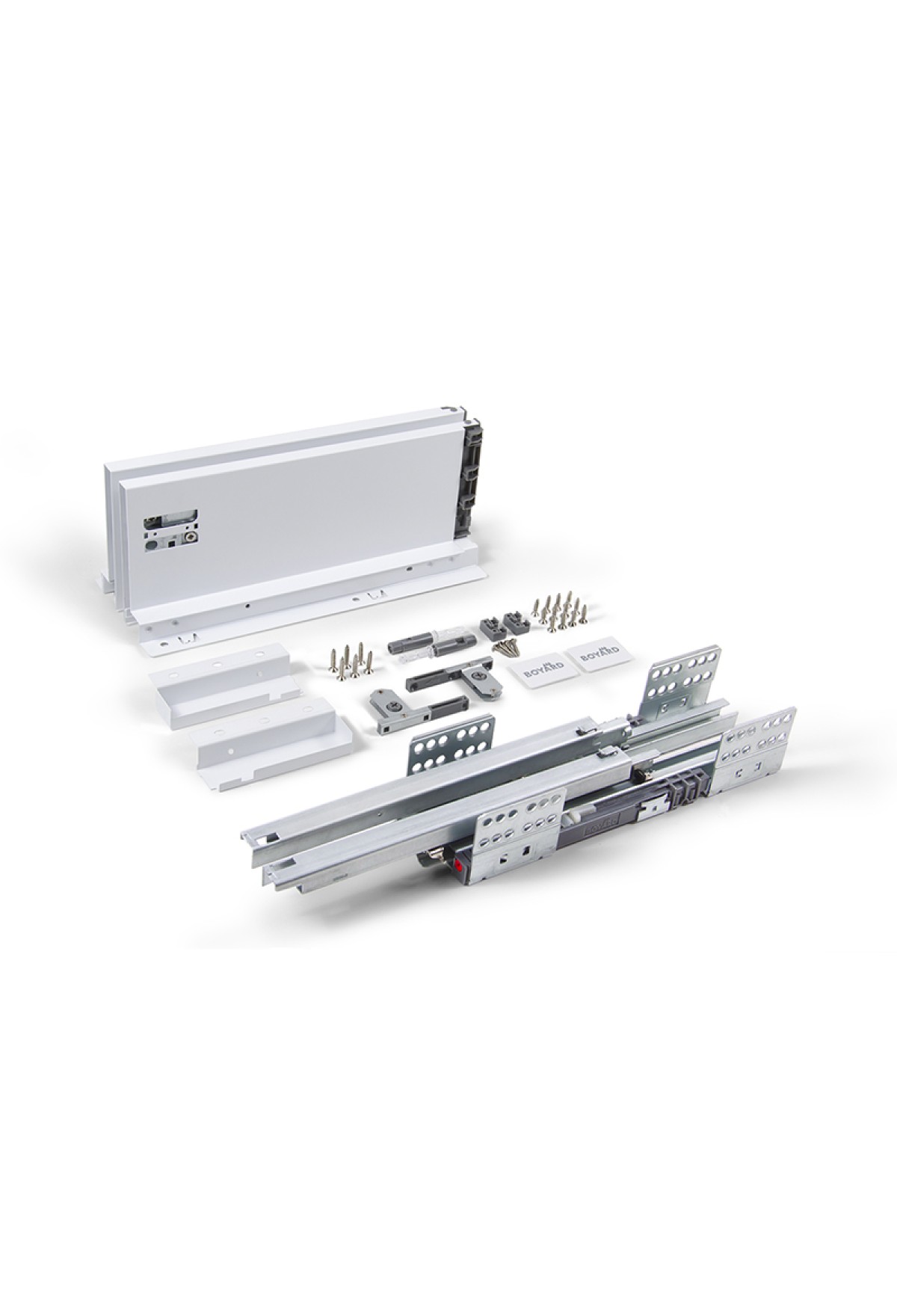 СТАРТ PUSH SB29 — комплект систем выдвижения для сборки выдвижного мебельного ящика с прямыми боковинами средней высоты с открытием от нажатия для мебели без ручек.