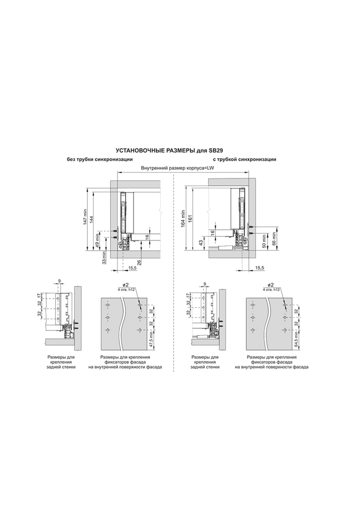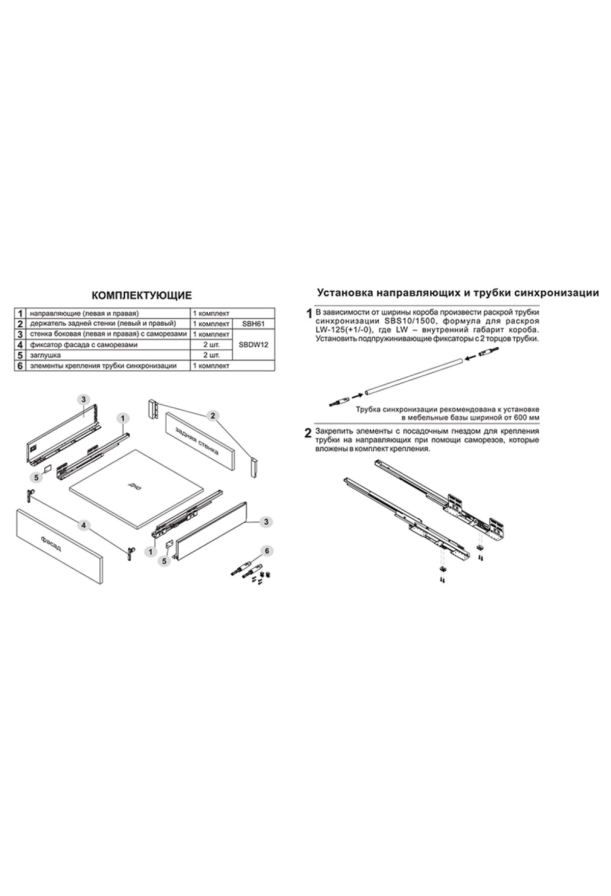 Комплект SB29 включает в себя: направляющие (левая и правая), детали для установки трубки синхронизации с крепежом, держатели задней стенки, традиционные боковые стенки, фиксаторы фасада, заглушки, крепёж.