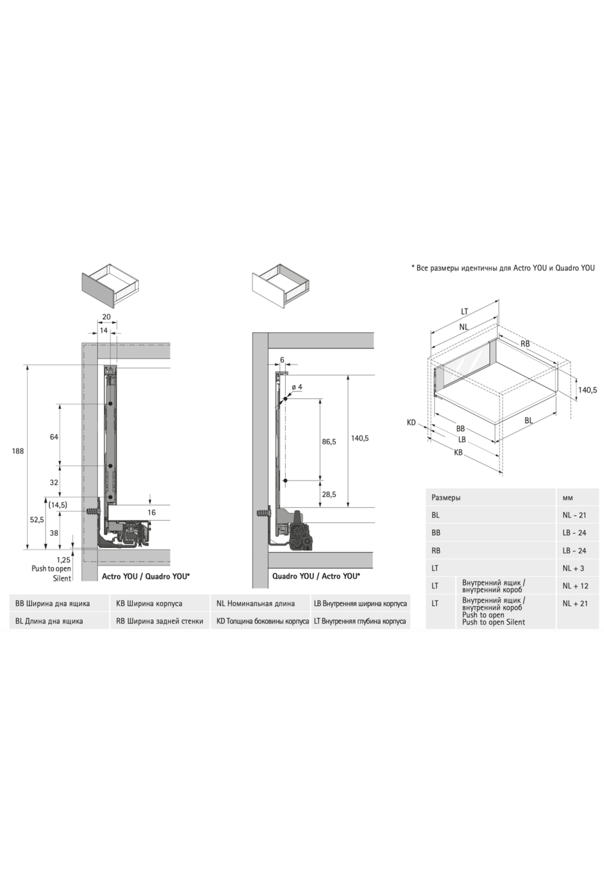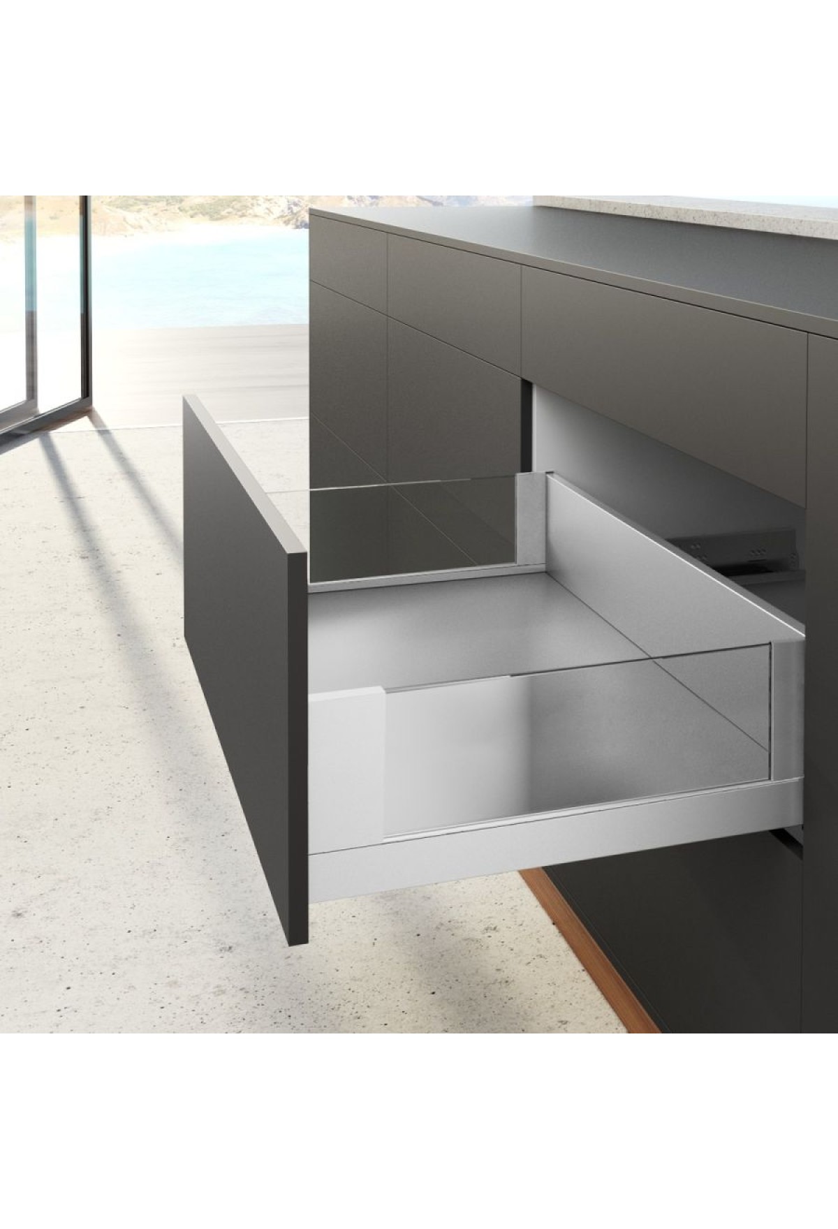 Опционально можно установить систему Push to open Silent для открывания от нажатия+плавного закрывания ящика.