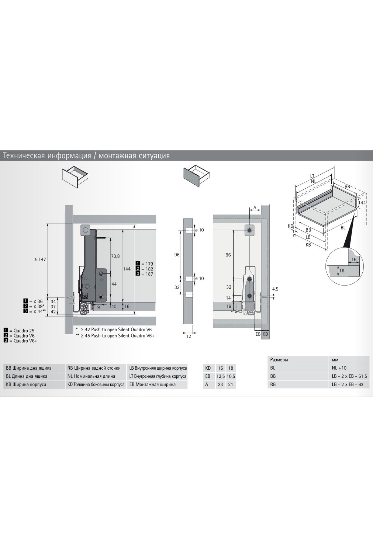 • 2 направляющие Quadro полного выдвижения с механизмом Push to open, левая и правая