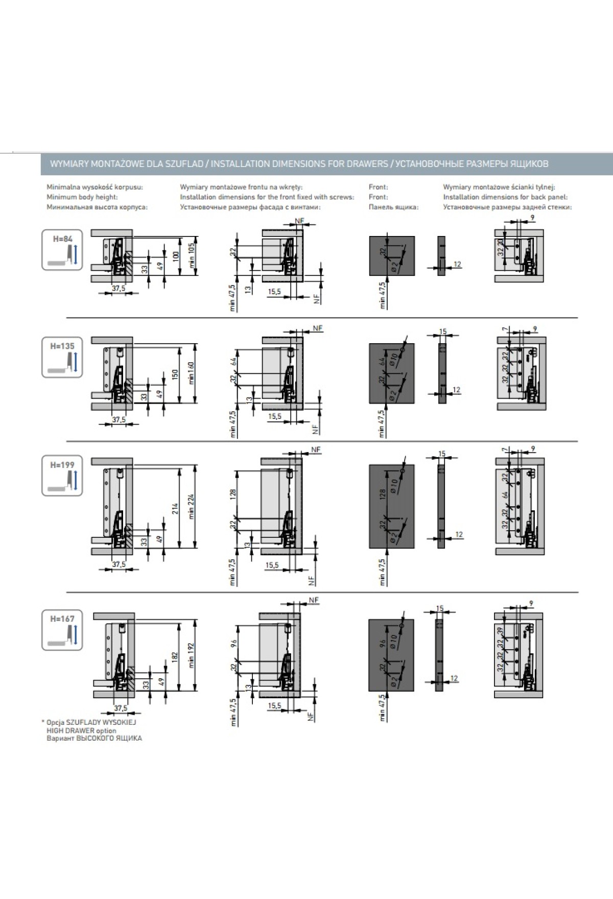 При проектировании мебельного изделия необходимо учесть техническое примечание от производителя; для правильной работы направляющей рекомендованная ширина ящика не должна превышать номинальной длины направляющей. Для данной модели номинальная длина направляющих = 450 мм.