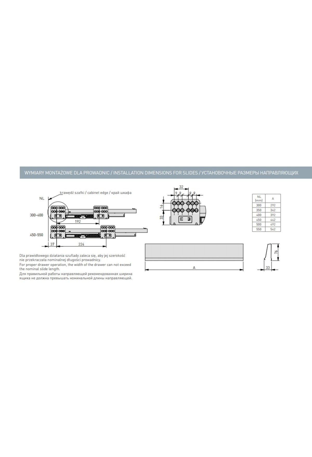При проектировании мебельного изделия необходимо учесть техническое примечание от производителя; для правильной работы направляющей рекомендованная ширина ящика не должна превышать номинальной длины направляющей. Для данной модели номинальная длина направляющих = 500 мм.