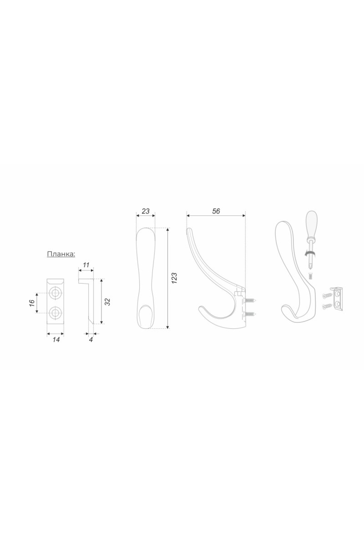| Комплектация крепежом | 1 крючок в полиэтиленовой упаковке, 2 самореза 4*18, крепёжная планка, фиксирующий винт |