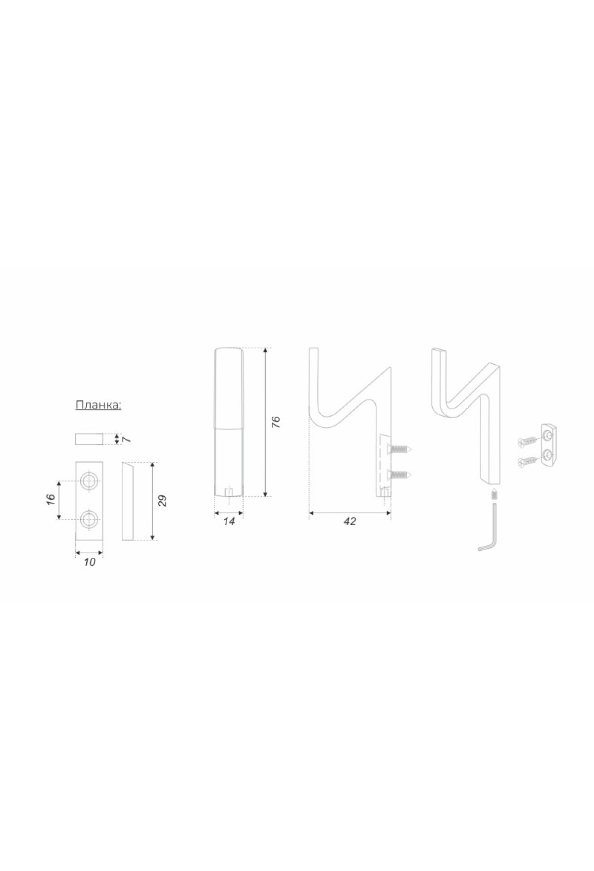 В комплект входит: крючок, крепёжная планка, саморезы 4х18 (2 шт.), крепёжный винт (1 шт.), шестигранный ключ.