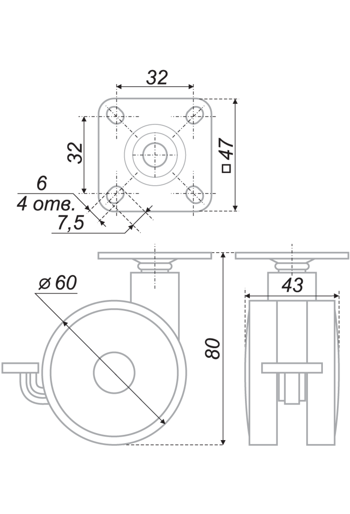 Колесо мебельное для выкатных тумб, кресел. На опору установлен тормоз, который четко фиксирует мебель в одном положении. Материал: основа нейлон + пластиковые вставки.