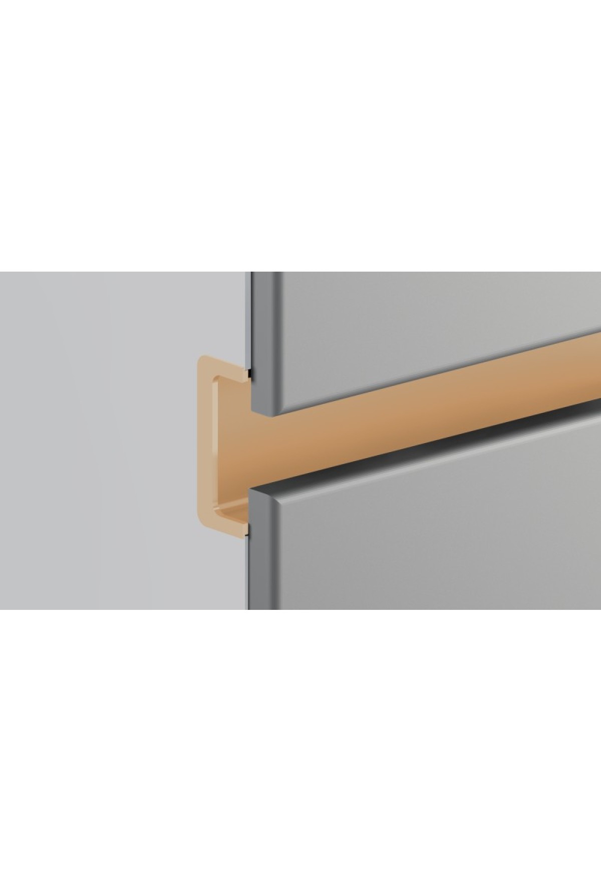 RP050 — C-образный профиль GOLA BALANCE для фасадов второго и следующих рядов нижней базы мебельного гарнитура. Модель устанавливается между ящиками и позволяет захватывать как нижний, так и верхний фасады. Полезная длина RP050 составляет 4100 мм.