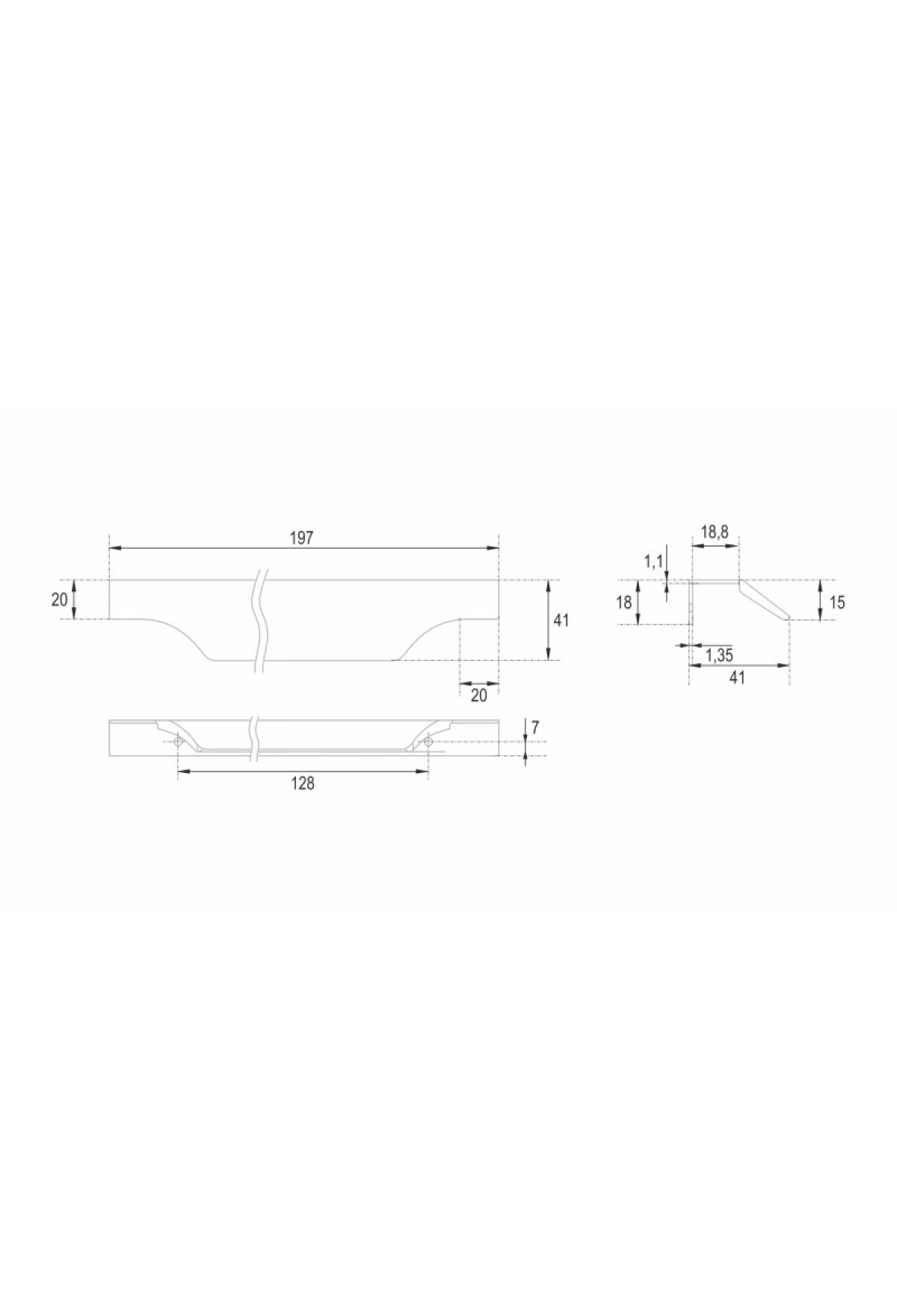WING RT114 — торцевая ручка с изгибом из алюминия, устанавливается наложением на фасады толщиной 18,8 мм (в цветах BL,GR,SC,SG) и 18,5 мм (в цвете W).