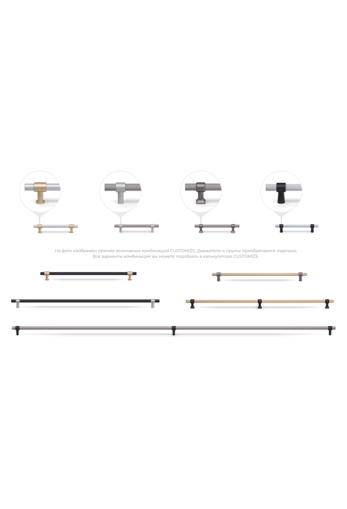 CUSTOMIZE – это серия кастомных ручек, которые клиент создает сам под свой авторский мебельный проект. 4 дизайна держателя мебельной ручки, 3 дизайна прутка, множество длин, трендовые оттенки – всё это открывает огромный простор для стильных творческих экспериментов.