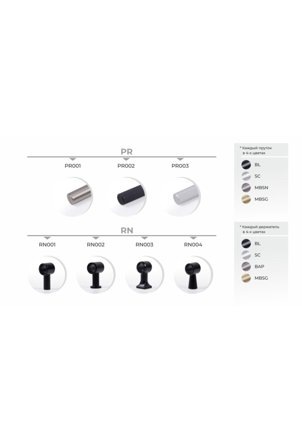 Прутки поставляются без крепежа и без держателей. Держатели для прутка мебельной ручки подбираются производителем мебели самостоятельно и предлагаются в комплекте с крепежом. Пруток не может быть прикреплен к фасаду без использования держателей-ножек.