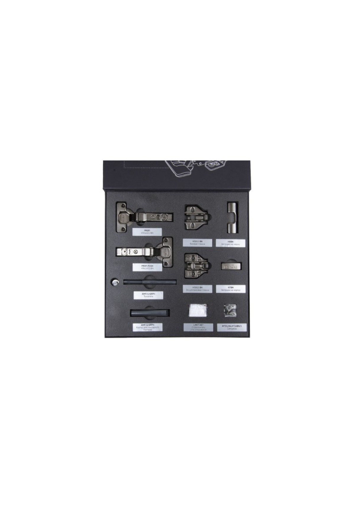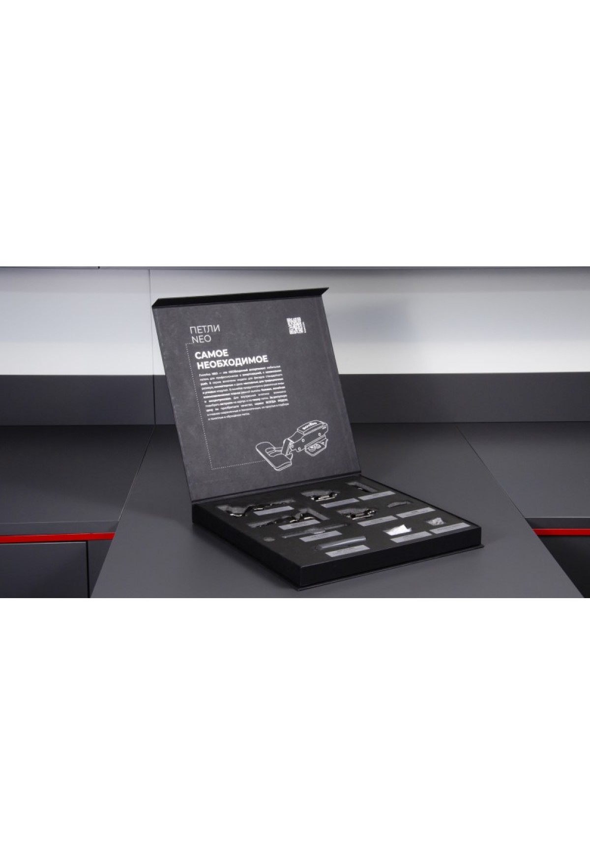 Набор можно поставить у себя в офисе или шоуруме или взять с собой на встречу, чтобы представить своим клиентам линейку технологичных мебельных петель NEO, наглядно показать, как собирается комплект, из чего он состоит, продемонстрировать визуальные и технические преимущества.